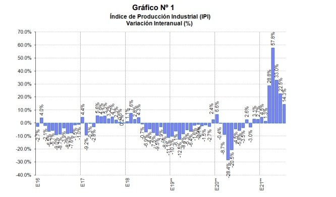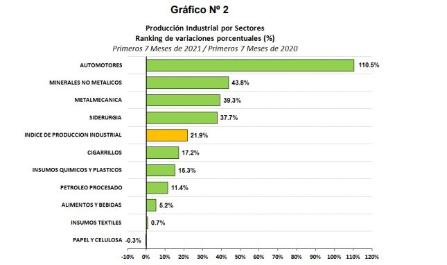 A nivel de ramas de actividad, en los primeros siete meses del año y en comparación con el mismo periodo de 2020, la producción automotriz continúa liderando el crecimiento con una mejora acumulada de 110.5%. Del mismo modo, con un avance acumulado entre enero y julio superior al promedio se encuentra el sector de minerales no metálicos que crece 43.8%, seguido de la producción metalmecánica (+39.3%) y la siderúrgica (+37.7%).