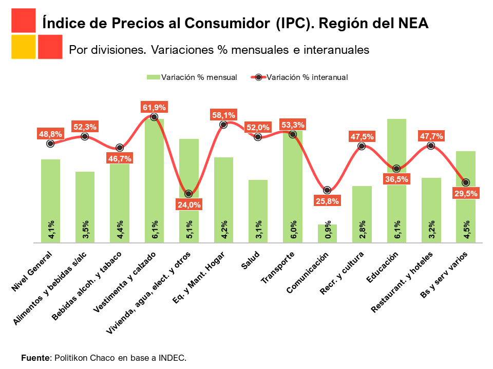 En este marco, las divisiones que mostraron la mayor alza en abril en el NEA fueron “Prendas de vestir y calzado” y “Educación”, ambas con incrementos del 6,1%, que se explican en los dos casos por factores estacionales (cambio de temporada e inicio de clases). El podio lo completa “Transporte” con una suba del 6% (con impactos de la suba de los combustibles).