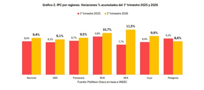Otro dato altamente negativo para la región es que en el acumulado del primer trimestre, la suba de precios en el NEA llegó al 11,5%, siendo también la más alta del país y se ubica, además, muy por encima de igual período del 2025 cuando fue de 7,7%.