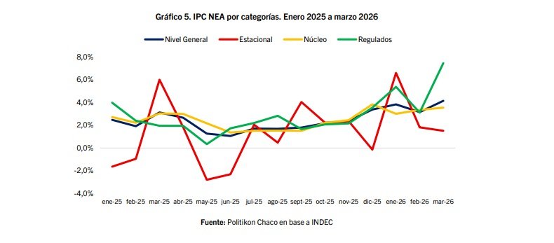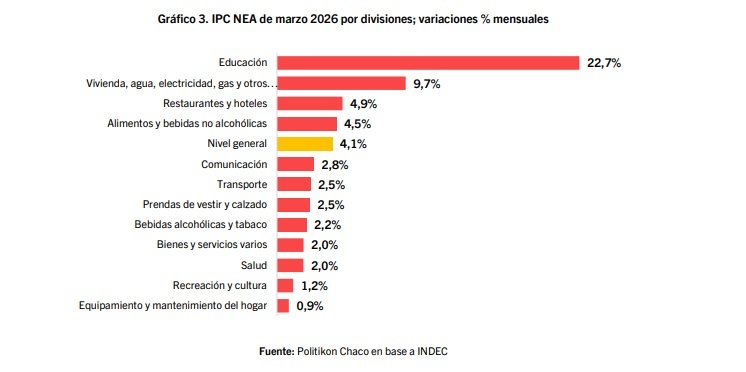 El Índice de Precios al Consumidor (IPC) de la región del NEA registró un alza del 4,1% en el mes de marzo de 2026 y fue la región con el mayor incremento de precios del país en ese mes. La suba es la mayor en diecinueve meses, además de registrar una fuerte aceleración respecto al mes previo, destacó un informe elaborado por la consultora Politikon Chaco en