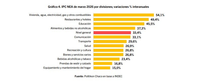 En el análisis de la comparación interanual, la división de Vivienda y servicios mostró la mayor suba en marzo en el NEA con 54,1%, seguida por Restaurantes y Hoteles (49,4%) y Educación (45,5%); en el extremo opuesto, Equipamiento y mantenimiento del hogar (15,0%) muestra la menor suba año/año.