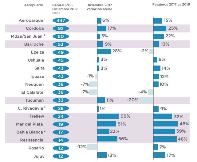 Durante los años 2016 y 2017, Aerolíneas lideró el crecimiento. Cerró el año con un 20% más de pasajeros que en el 2015 (y 22% en los vuelos de cabotaje), se abrieron 30 nuevas rutas nacionales y 15 nuevas internacionales. De las 45 nuevas rutas, 38 conectan ciudades sin hacer trasbordo en Buenos Aires. De las 15 nuevas rutas internacionales, 11 conectan las provincias con el exterior.