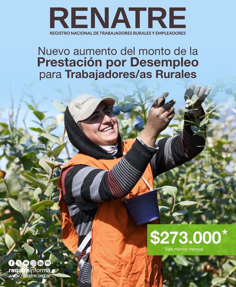 El Directorio del RENATRE resolvió una nueva actualización de la prestación por desempleo destinada a trabajadores y trabajadores rurales, fijando el monto máximo en $273.000 y el mínimo en $136.500 a partir del 1 de julio. Esta decisión implica un incremento del 5% respecto a la última suba realizada en mayo.