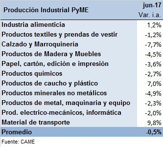 lLa producción de las pymes industriales cayó 0,5% en junio frente a igual mes del año pasado.