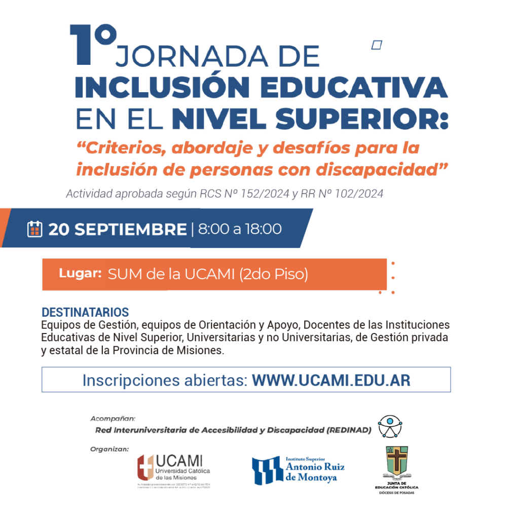 El viernes 20 de septiembre dará inicio la 1º Jornada de Inclusión Educativa en el Nivel Superior: “Criterios, abordaje y desafíos para la inclusión de personas con discapacidad” en el SUM de la Sede de la Universidad Católica de las Misiones de 8:00 a 18:00.
