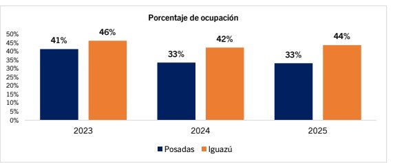 En términos de porcentaje de ocupación, en Posadas era del 41% para el 2023 y cayó al 33% en 2024, sosteniendo igual nivel en 2025; por segmento, los establecimientos parahoteleros tuvieron un 34% de ocupación y 33% en los hoteleros.