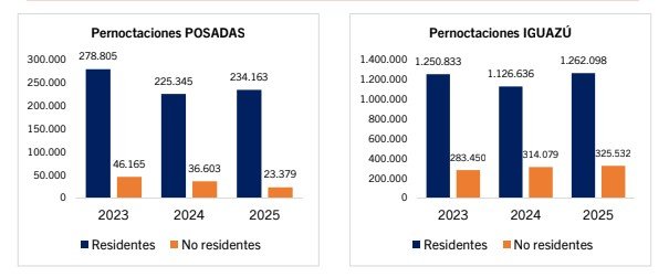 De la mano de las variaciones en la cantidad de viajeros, se ven también cambios en las cifras de pernoctaciones: mientras que en Posadas cayeron 1,7% contra 2024, en Iguazú  crecieron 10,2%; en ambos casos, los turistas nacionales tuvieron un desempeño mejor.