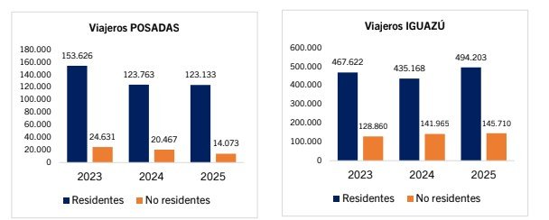 En Iguazú, en cambio, el escenario es opuesto: los viajeros crecieron 10,9% en 2025 contra  2024, con mayor fuerza en los turistas nacionales (+13,6%) aunque también con incremento de los extranjeros, pero en menor velocidad (+2,6%). Si se compara contra el 2023, los visitantes totales crecen en 7,3%, aunque en este caso impulsado por el turismo no residente (+13,1%) pero también crecieron los residentes (5,7%).