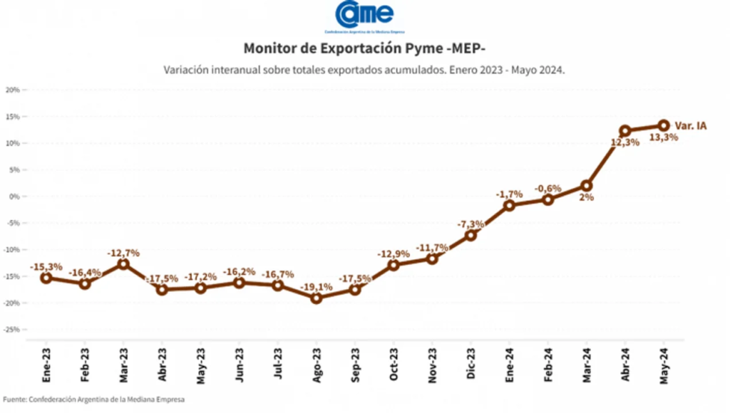 De esta manera, es el tercer mes consecutivo que los envíos al exterior de las pequeñas y medianas empresas registran un saldo positivo en dólares, tras el crecimiento del 2% interanual en marzo y del 12,3% en abril.