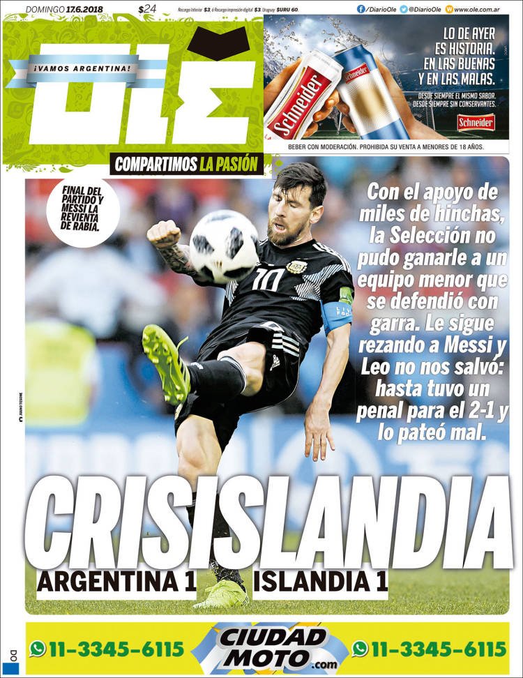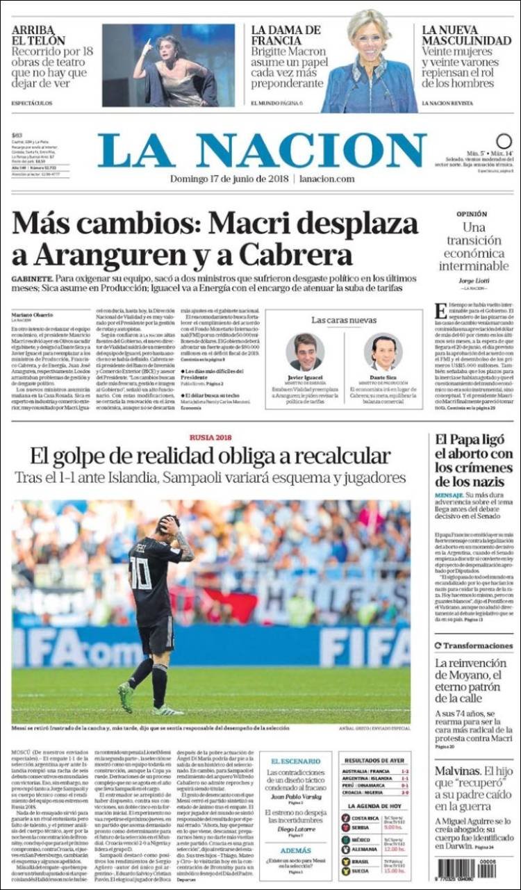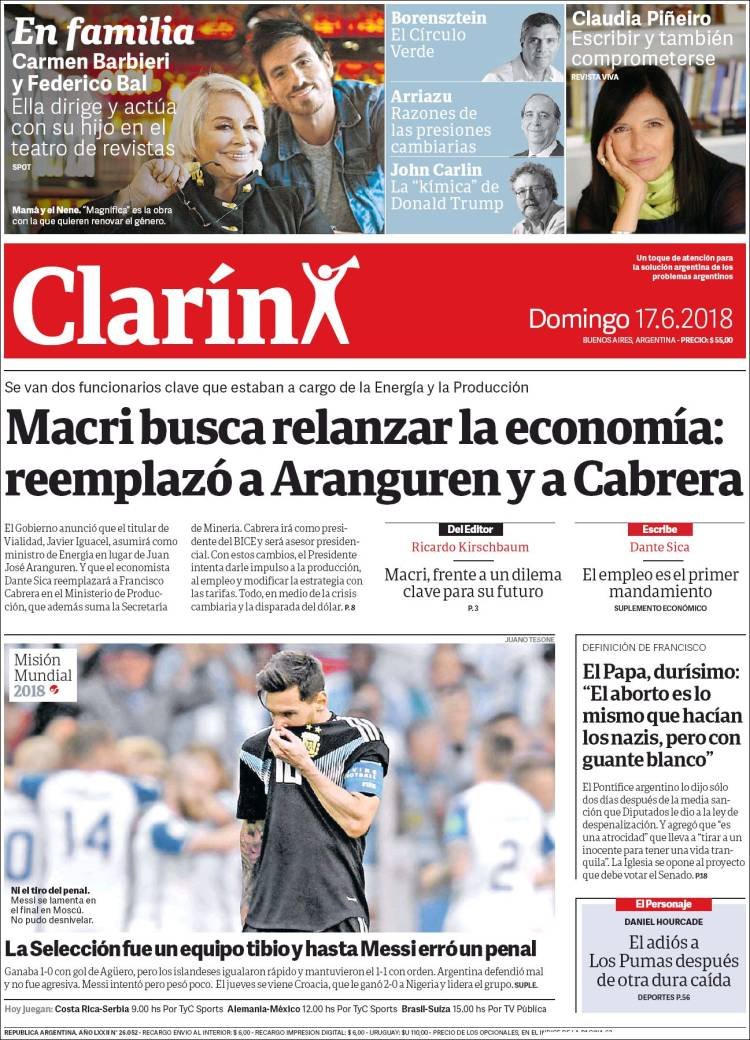 A continuación, repasamos las tapas de los diarios del domingo 17 de junio. El pobre debut de la Selección Argentina ante Islandia y los cambios en el cuestionado gabinete económico del presidente Mauricio Macri, son los temas predominantes. Página 12 sintetizó ambas realidades con un titular: “El mejor equipo no le ganó a nadie”.