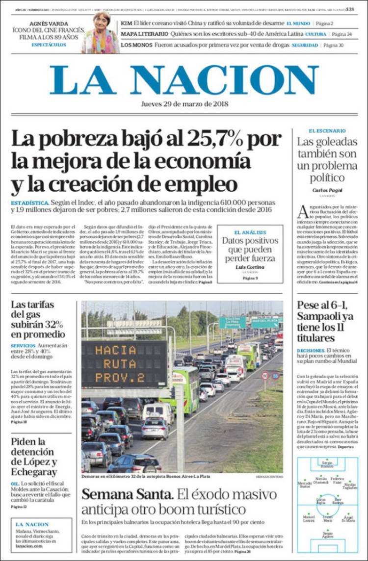 La reducción de la pobreza anunciada por el Presidente y el éxodo por Semana Santa fueron los temas elegidos por los medios de todo el país para sus tapas, el camino al mundial también sigue ocupando líneas.