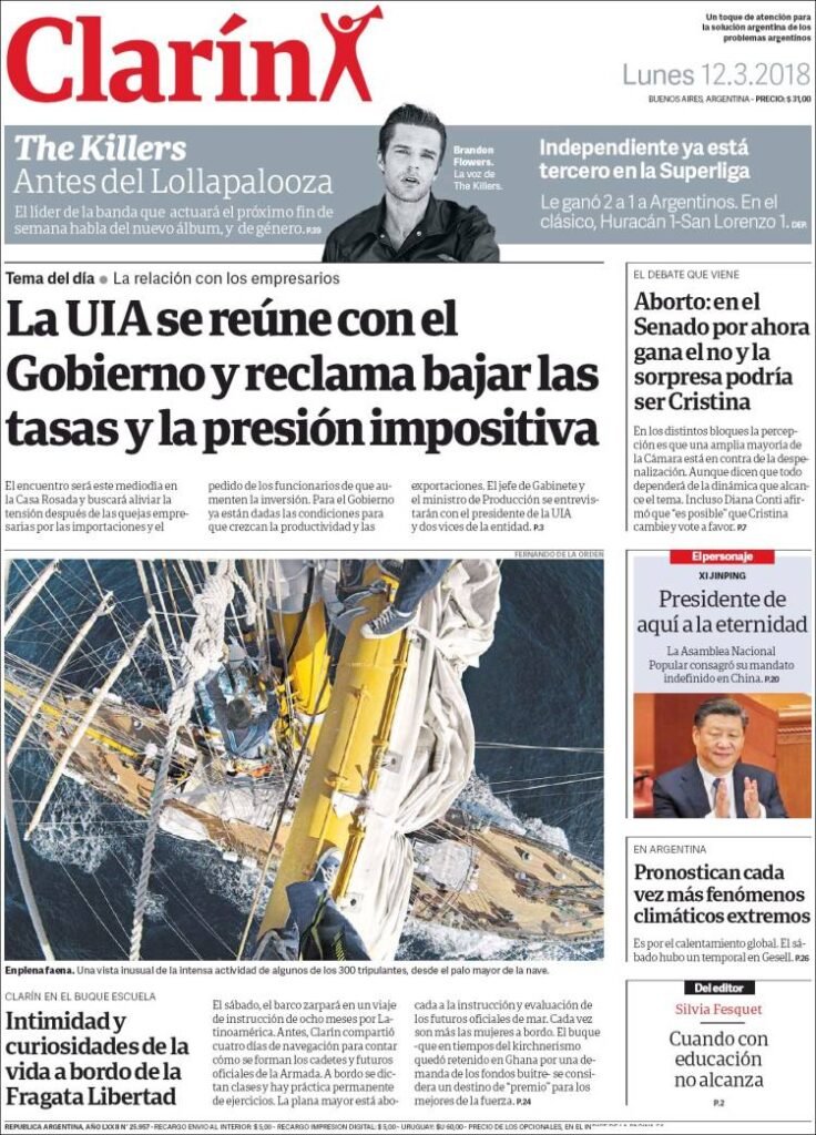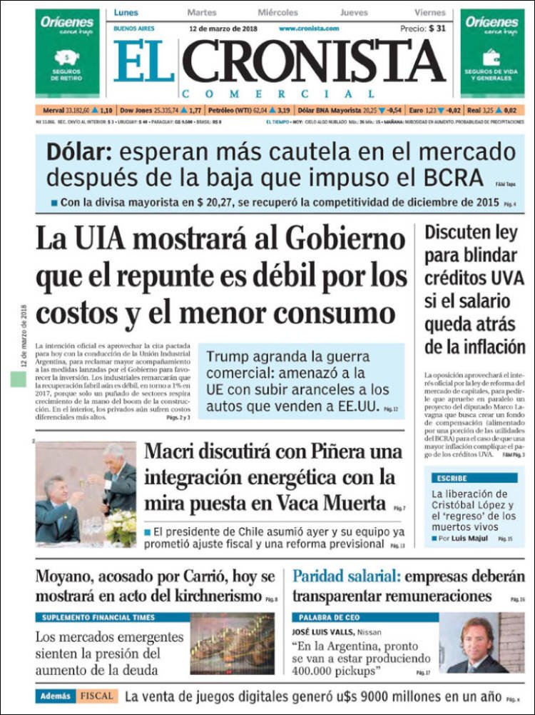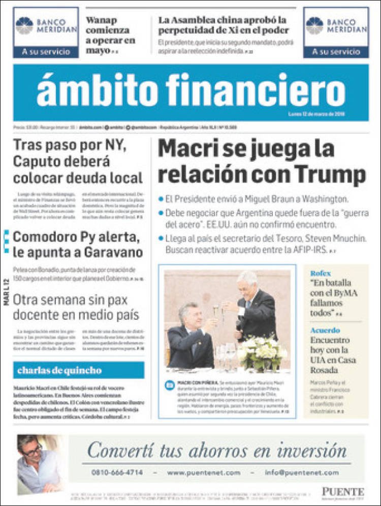 A continuación, reproducimos las tapas de los principales diarios de del país. Los temas predominantes son la reunión de los industriales con Macri, el comercio bilateral, la re-elección de Macri,