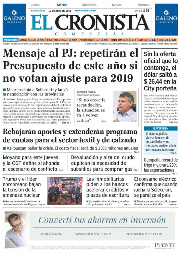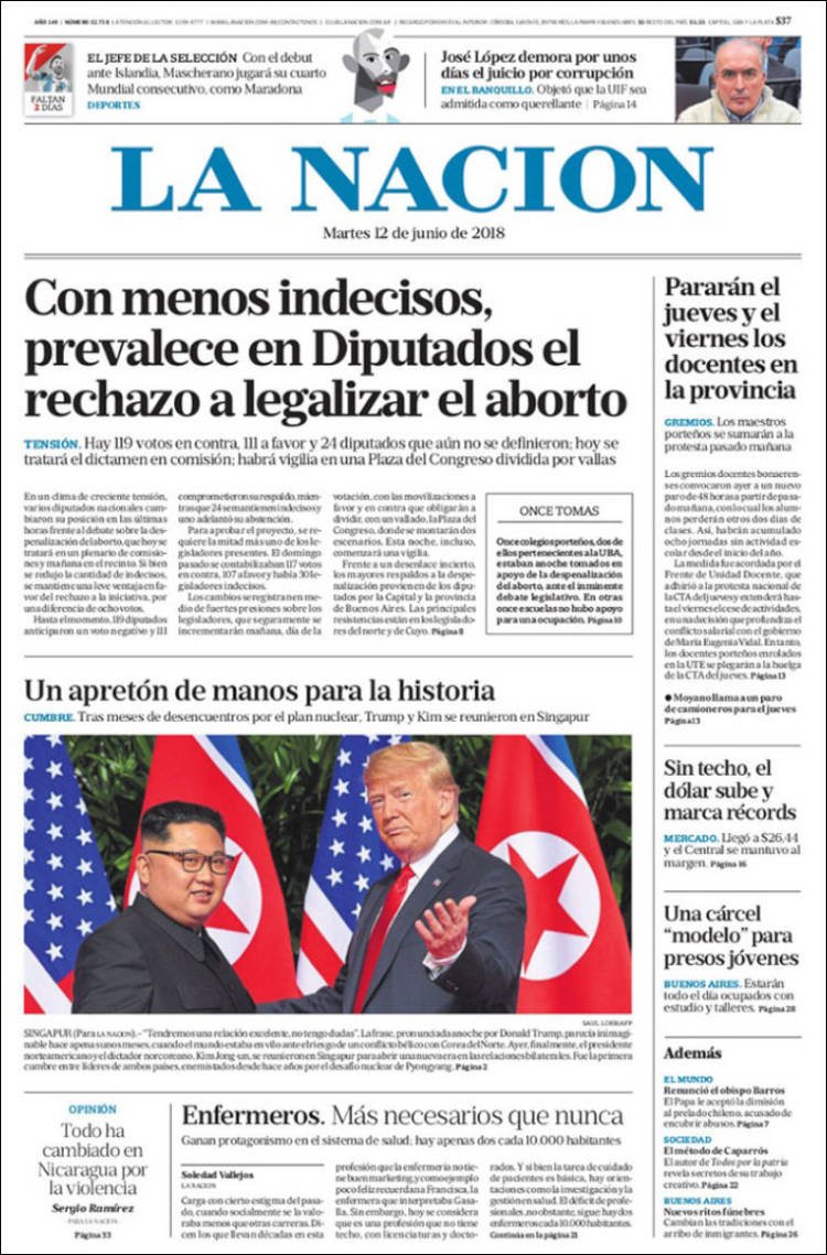 A continuación, repasamos las tapas de los diarios del 12 de junio. Los cálculos por el posible resultado del debate por la despenalización del aborto en Diputados es uno de los temas principales, junto con la Cumbre entre Trump y Kim, el lider norcoreano. También, las alternativas de la previa del Mundial de Rusia.