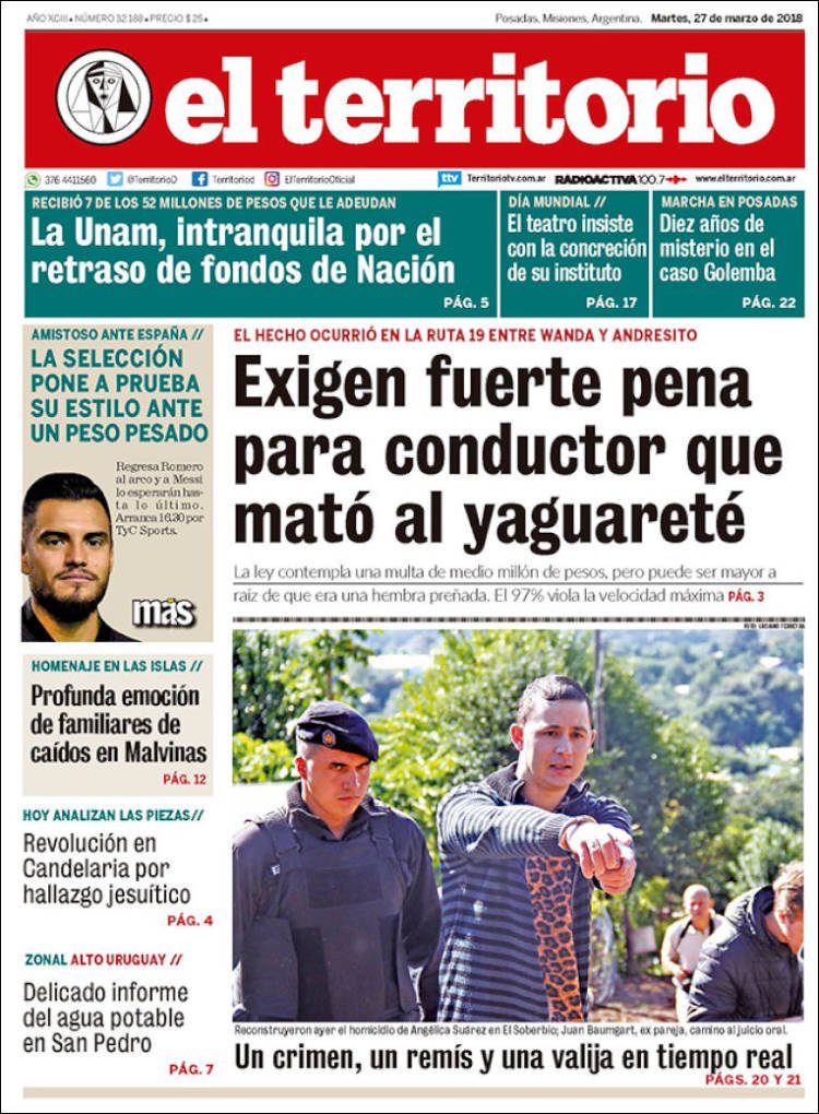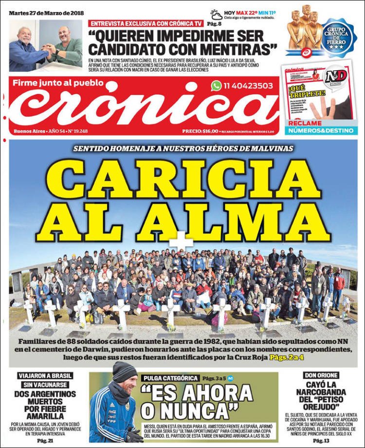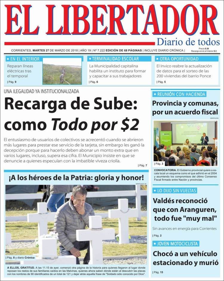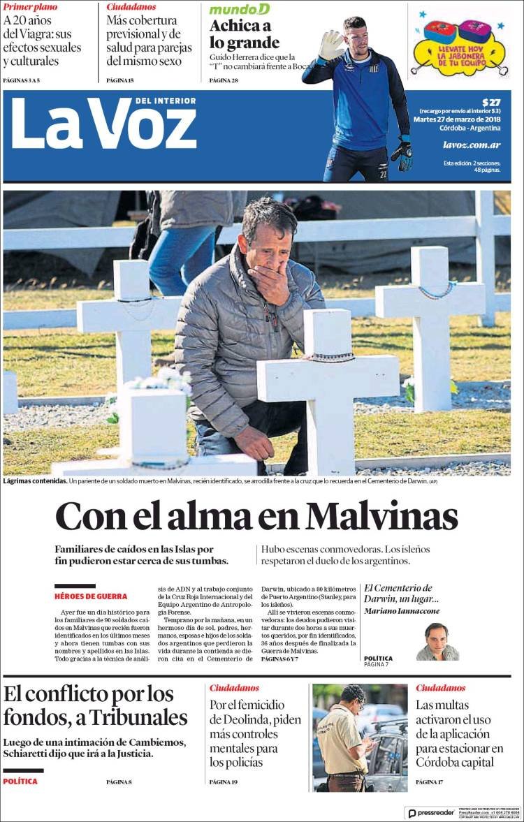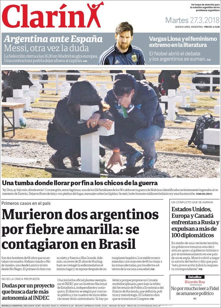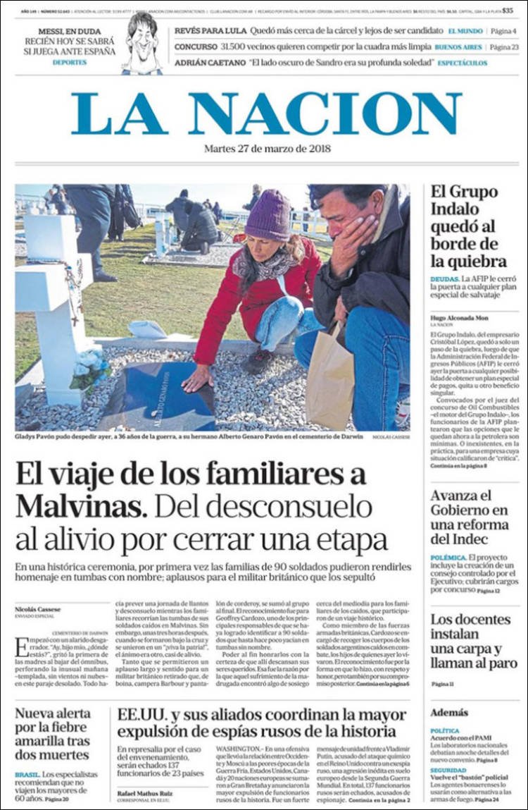 La visita de los familiares de los soldados cuyos restos fueron identificados en el cementerio de Darwin siegue siendo el tema de tapa de los diarios, los dos fallecidos por fiebre amarilla y la paritaria docente. En Misiones los medios hablan del fallecimiento de la yaguareté, la inseguridad y el camino al mundial de fútbol.