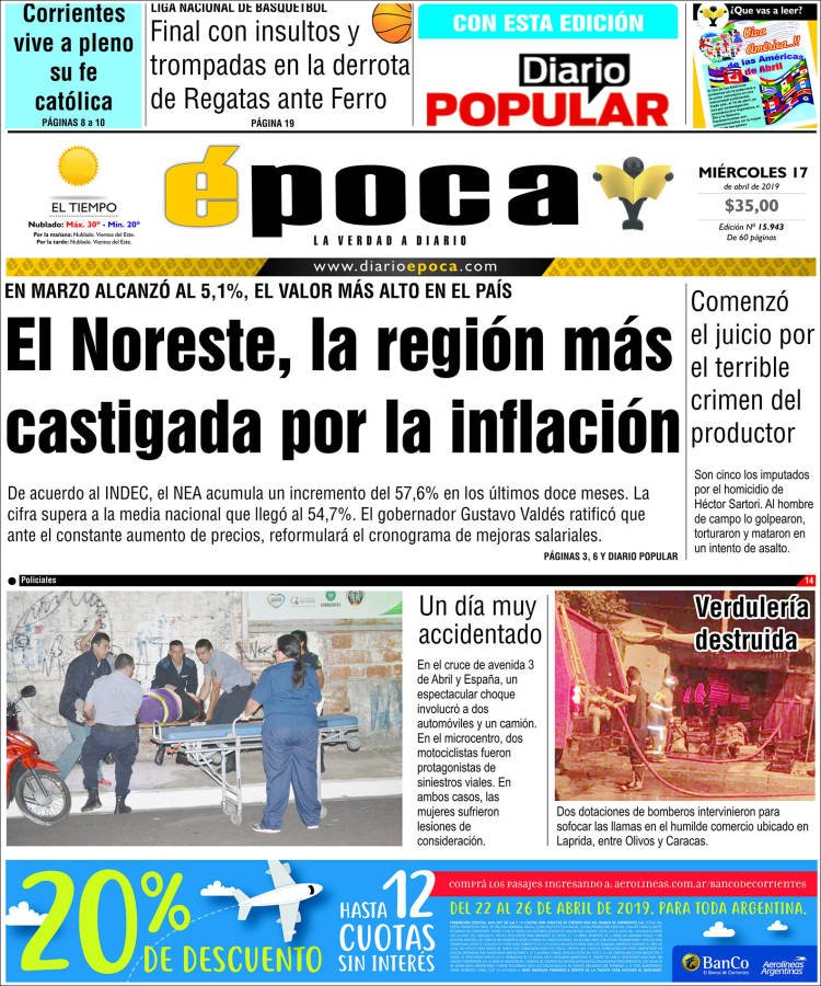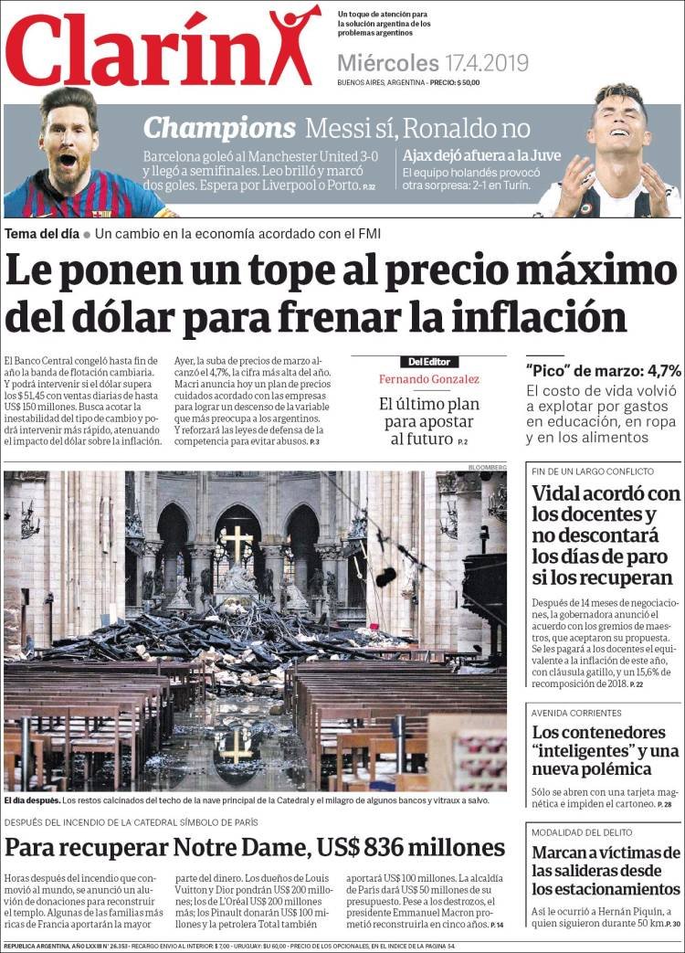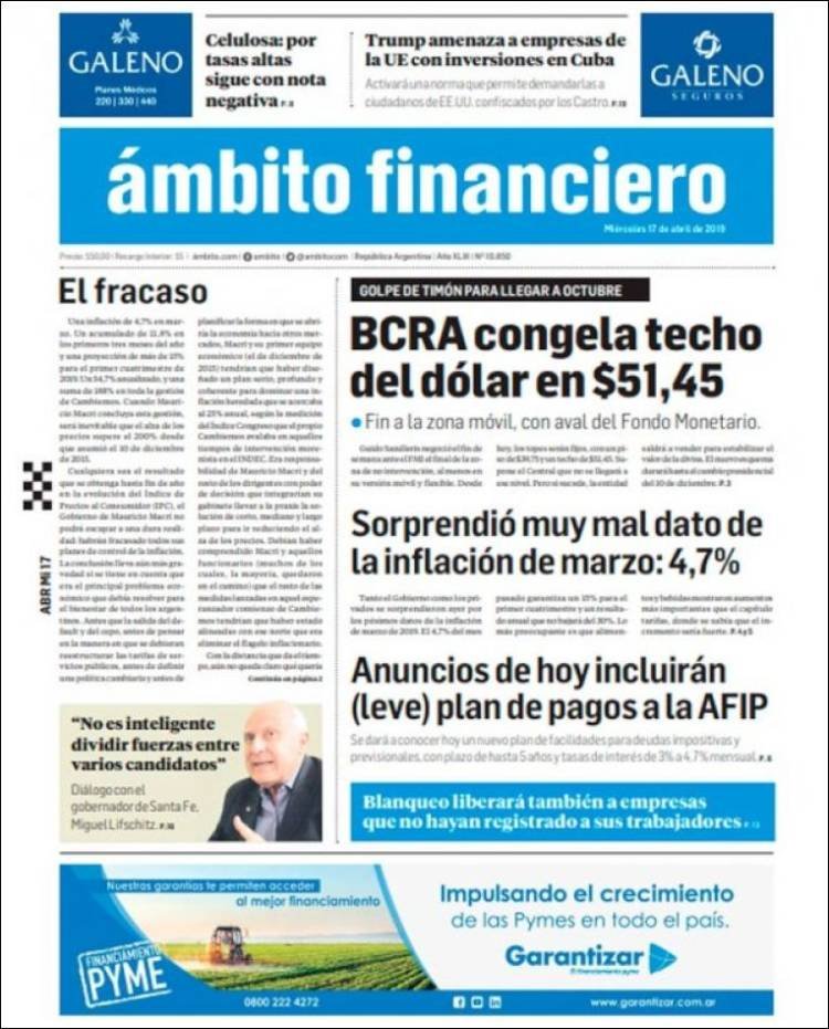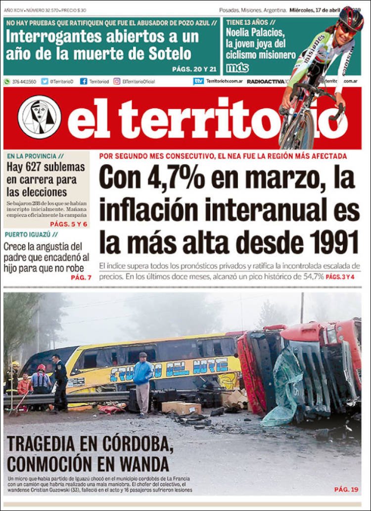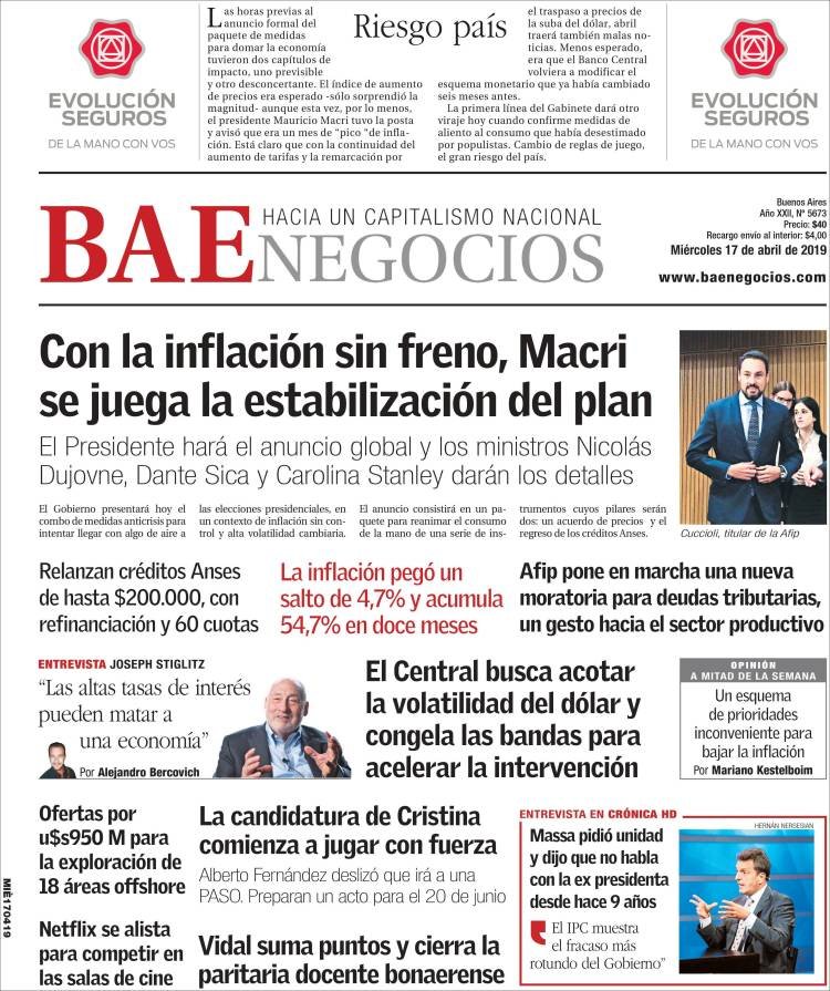 A continuación, repasamos las tapas de los diarios del miércoles 17 de abril. La inflación de 4,7% en el mes de marzo, que da como resultado un acumulado de los últimos 12 meses de 54,7% fue sin dudas el tema excluyente en las portadas. Es la inflación más alta desde 1991, antes de instaurarse el 1 a 1 y con una Argentina que padecía la hiperinflación.