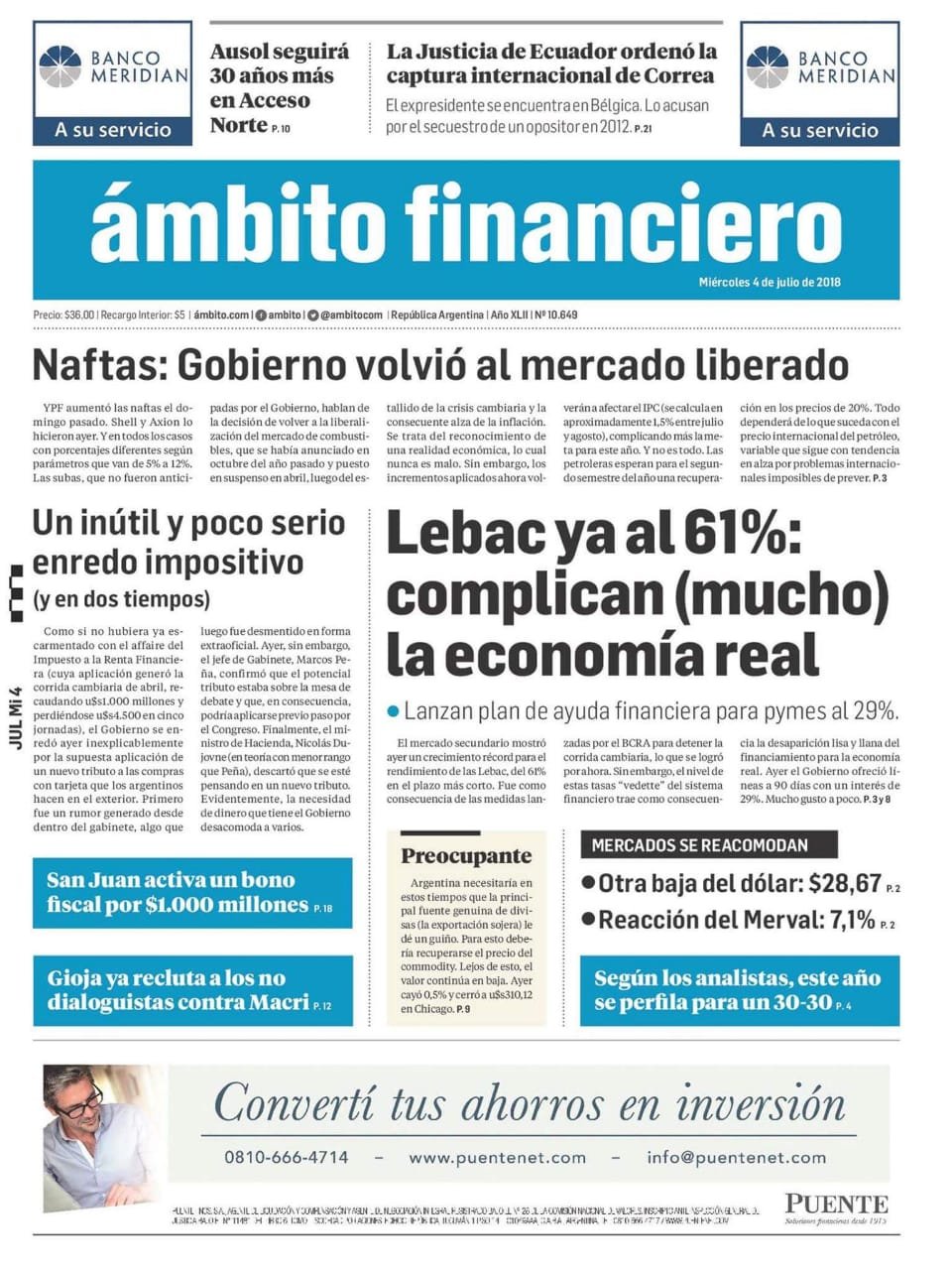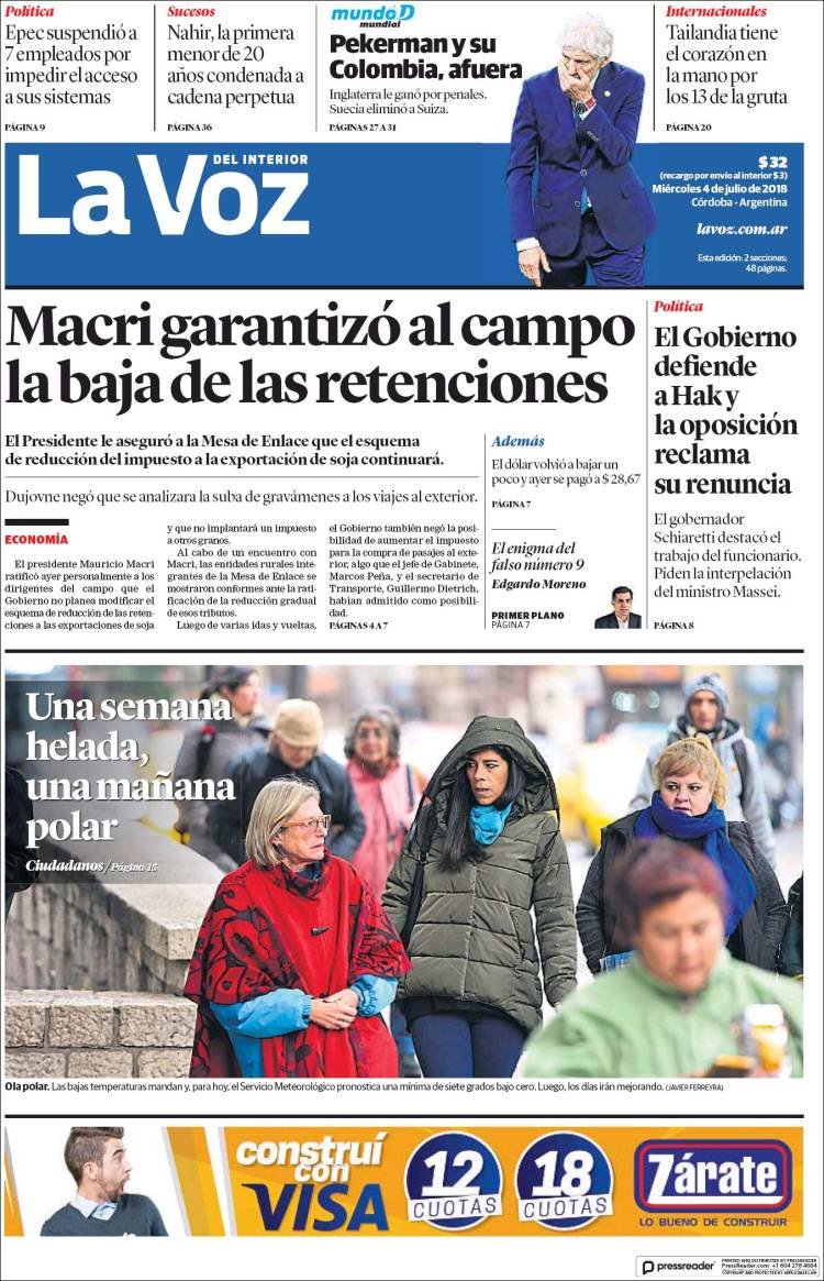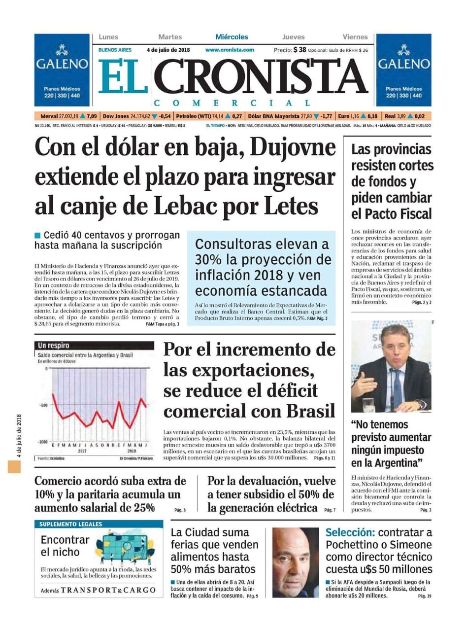 A continuación reproducimos las tapas de los principales diarios del país. El dólar perdió impulso y el Gobierno busca acelerar el canje de las Lebac por Letes y reducir el impacto de la especulación financiera en la economía real.