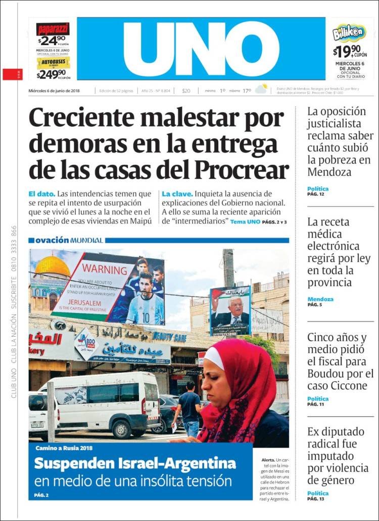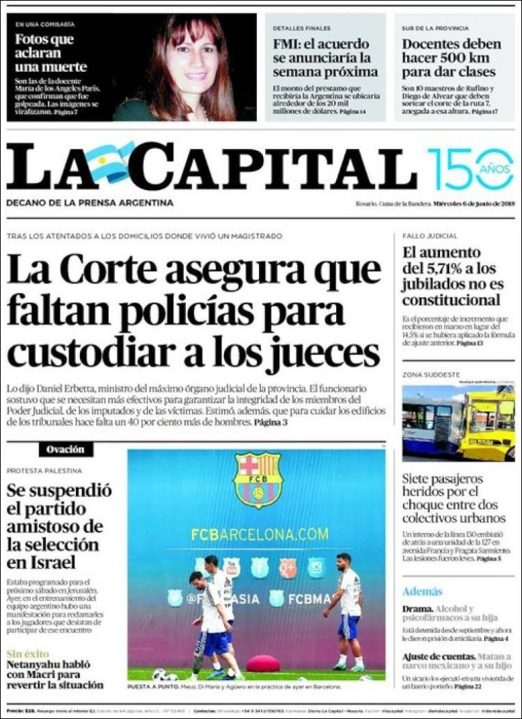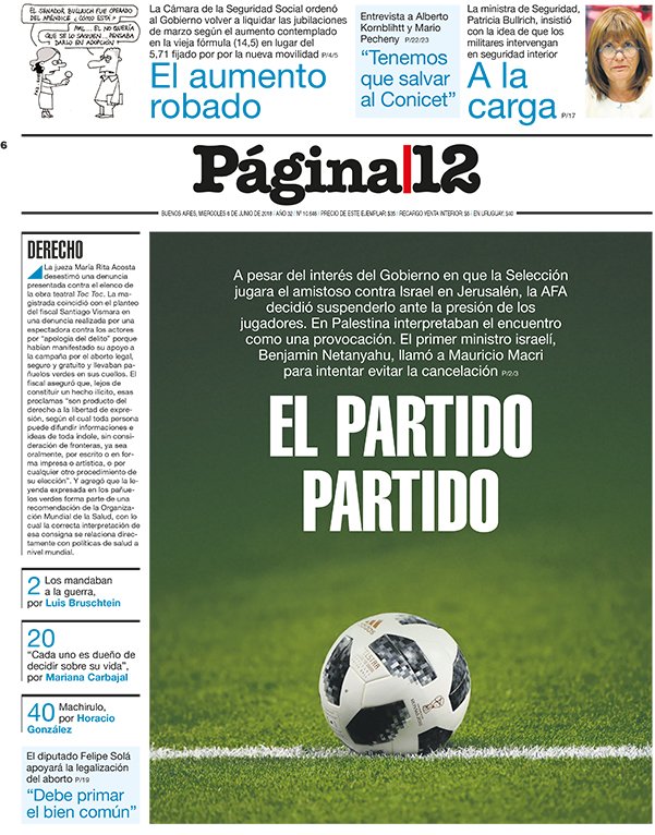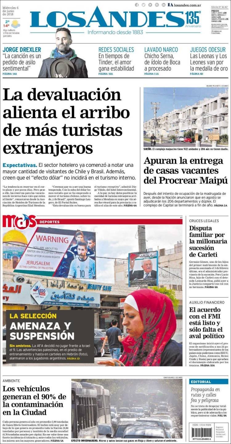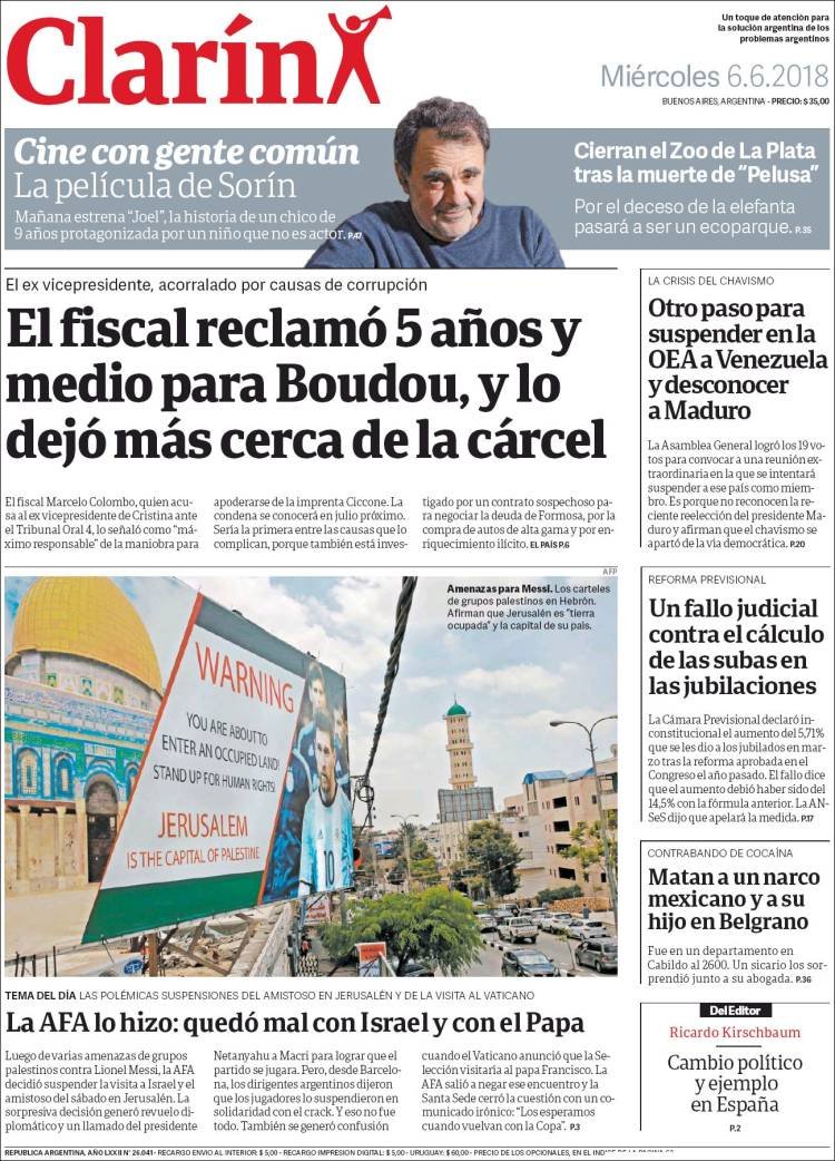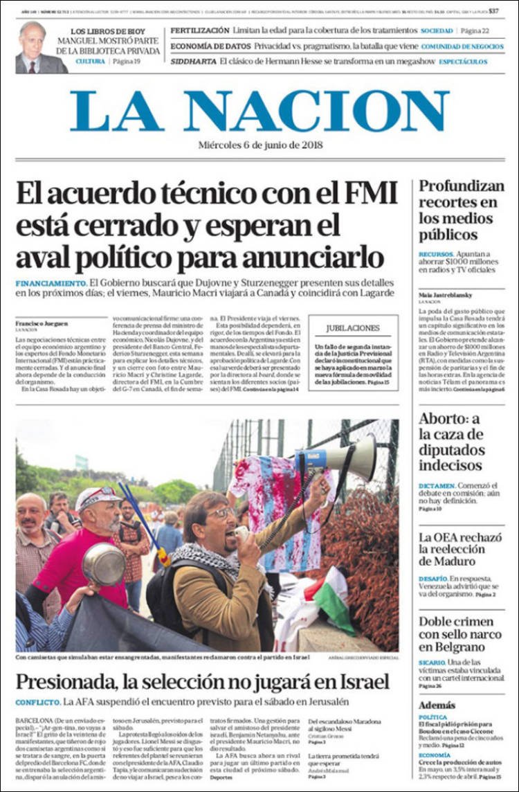 A continuación, repasamos la tapa de los diarios del miércoles 6 de junio. La polémica por la cancelación del partido en Jerusalén, la cancelación de la visita al Papa y lo que algunos califican como “papelón” internacional por parte de la AFA es el tema principal. Además, los mercados subieron en la Argentina y preanuncian, dicen analistas, un inminente acuerdo con el FMI.