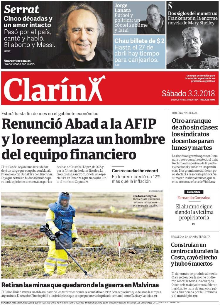 A continuación, reproducimos las tapas de los principales diarios de del país. Los temas predominantes son la renuncia del titular de la Afip y el paro de docentes de Ctera.