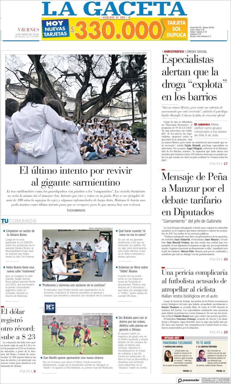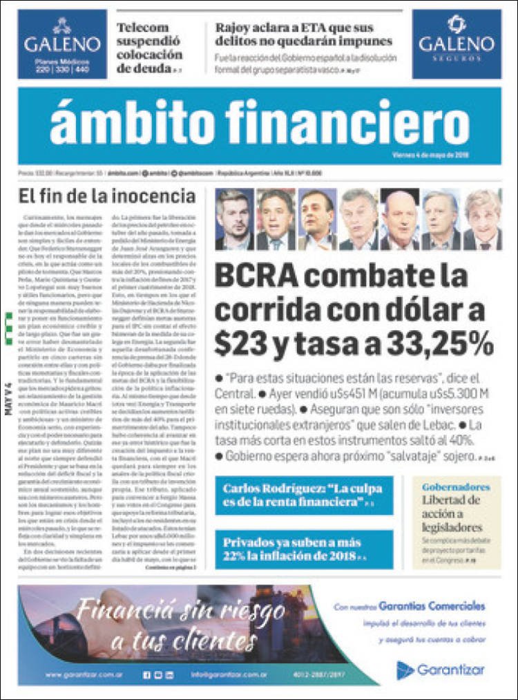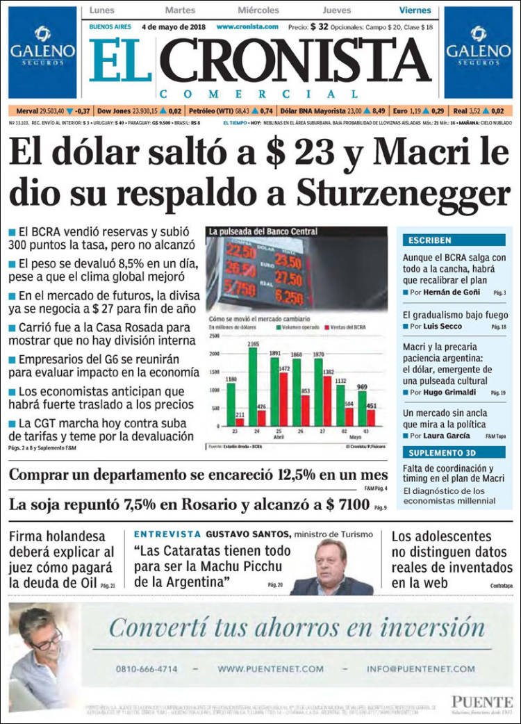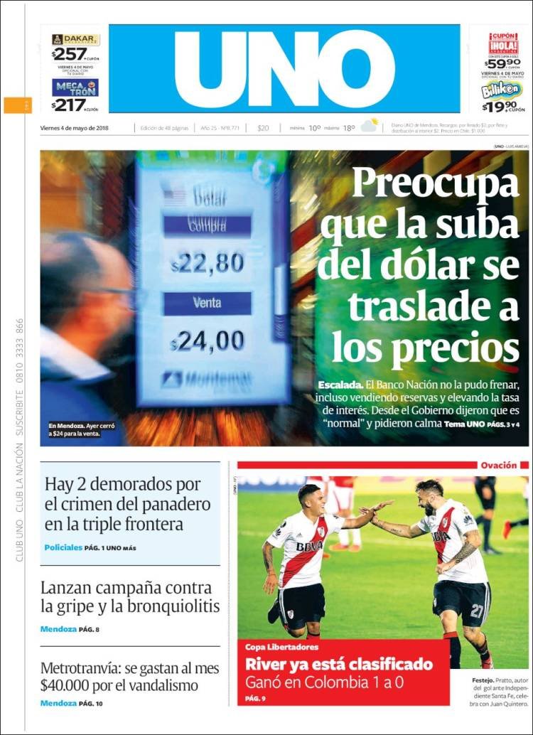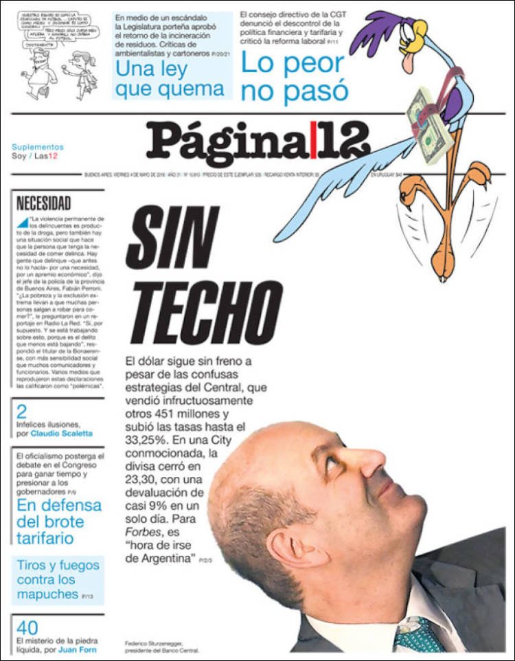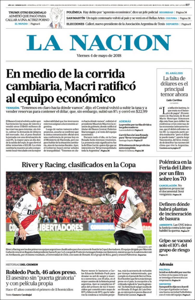 A continuación reproducimos las tapas de los principales diarios del país. En ellas la corrida del dólar y el respaldo a la política monetaria del BCRA por parte del Presidente Mauricio Macri ocupan los espacios principales de las portadas.