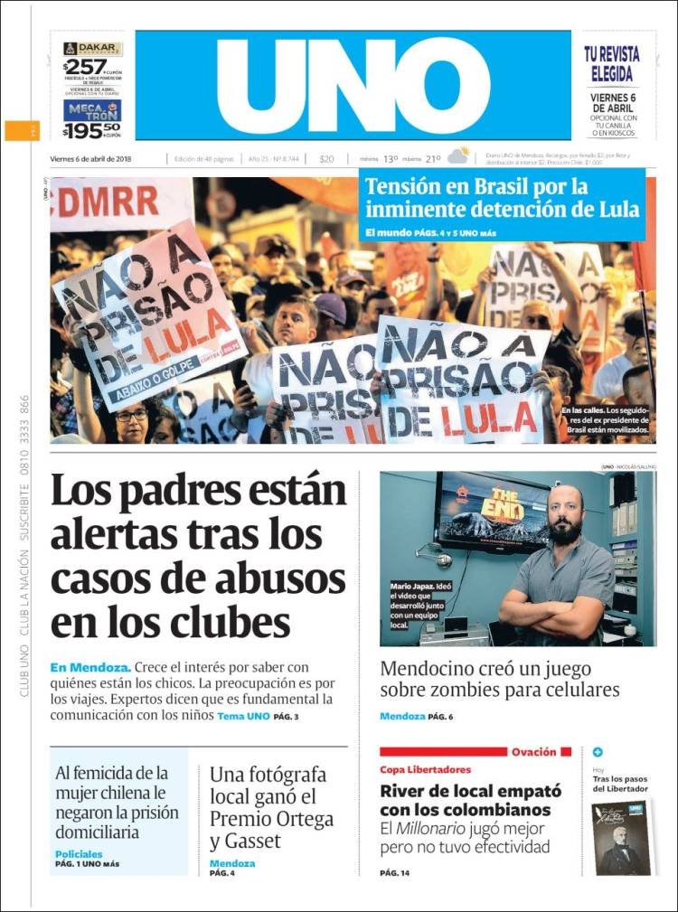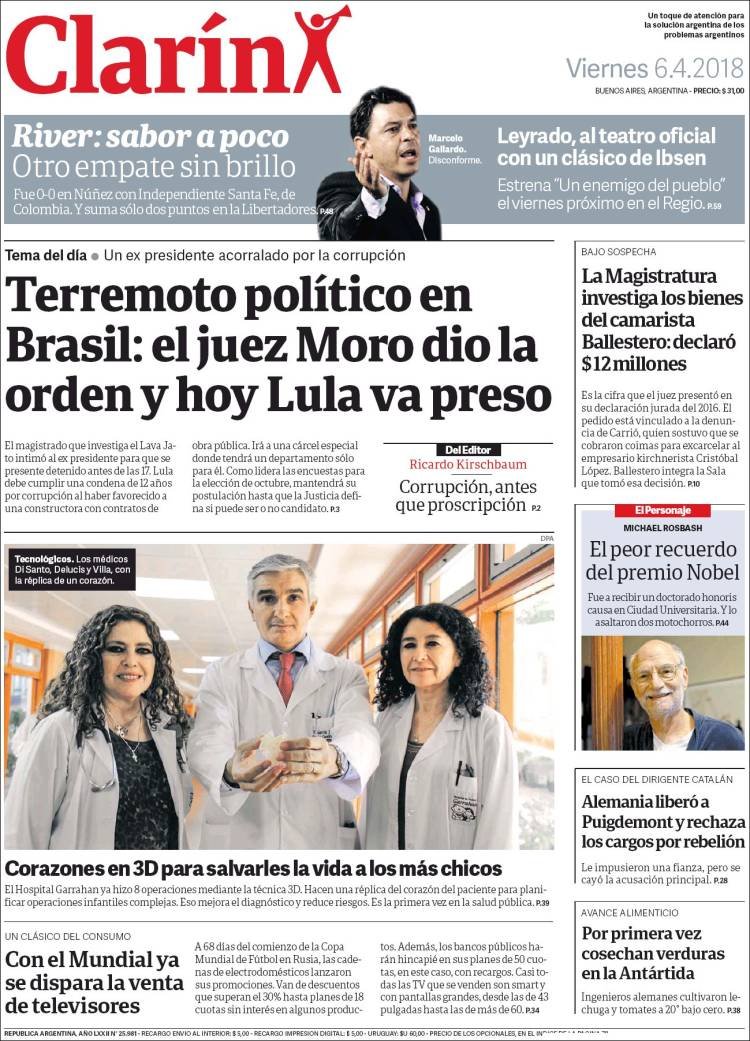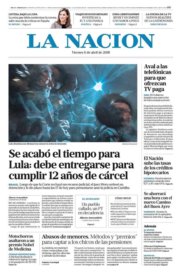 A continuación reproducimos las tapas de los principales diarios del país. La noticia más relevante es la detención del ex presidente brasileño Lula Da Silva.