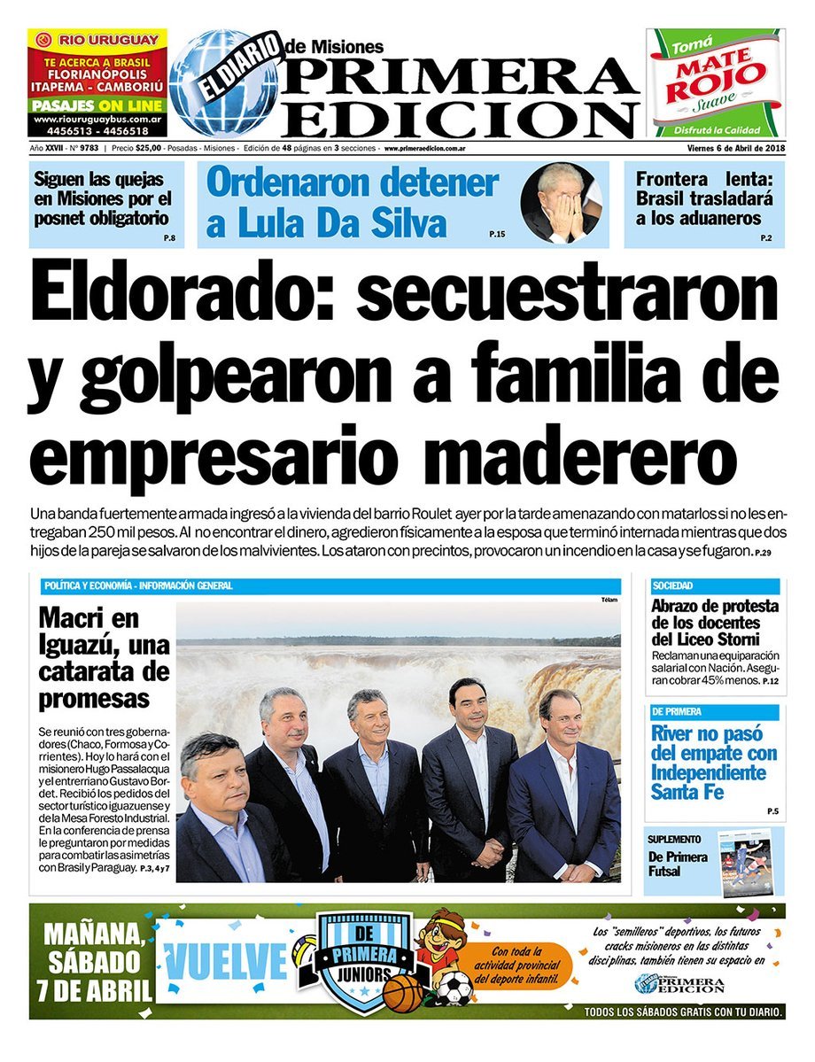 Las tapas de los diarios del viernes 6: Los anuncios de Macri en Misiones y la detención de Lula