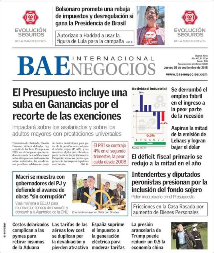 A continuación, repasamos las tapas de los diarios del jueves 20 de septiembre. La caída de la economía un 4,2 por ciento en agosto es uno de los temas principales. Un dato muy curioso. En el día de ayer, la detención de Oscar Thomas fue tema principal de La Nación y Clarín, los dos diarios de mayor tirada.