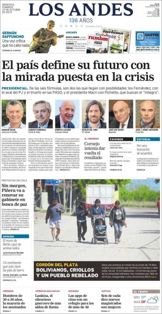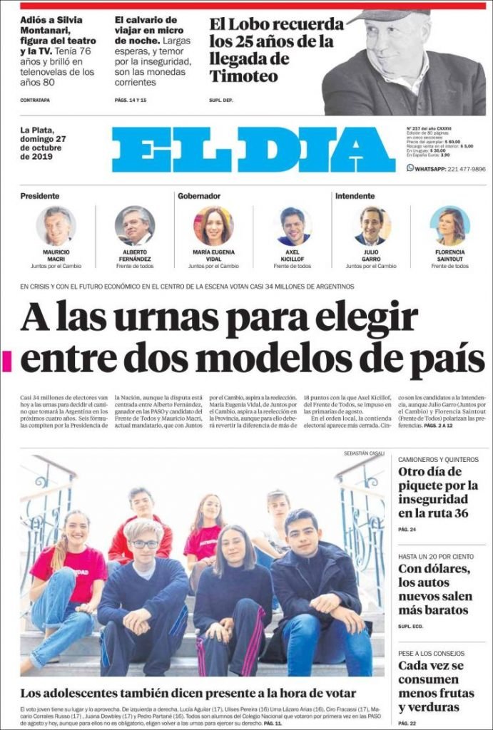 A continuación, las tapas de los diarios del domingo 27 de octubre, día en que los argentinos elegimos al próximo Gobierno Nacional. Cómo reflejó cada diario esta jornada histórica.
