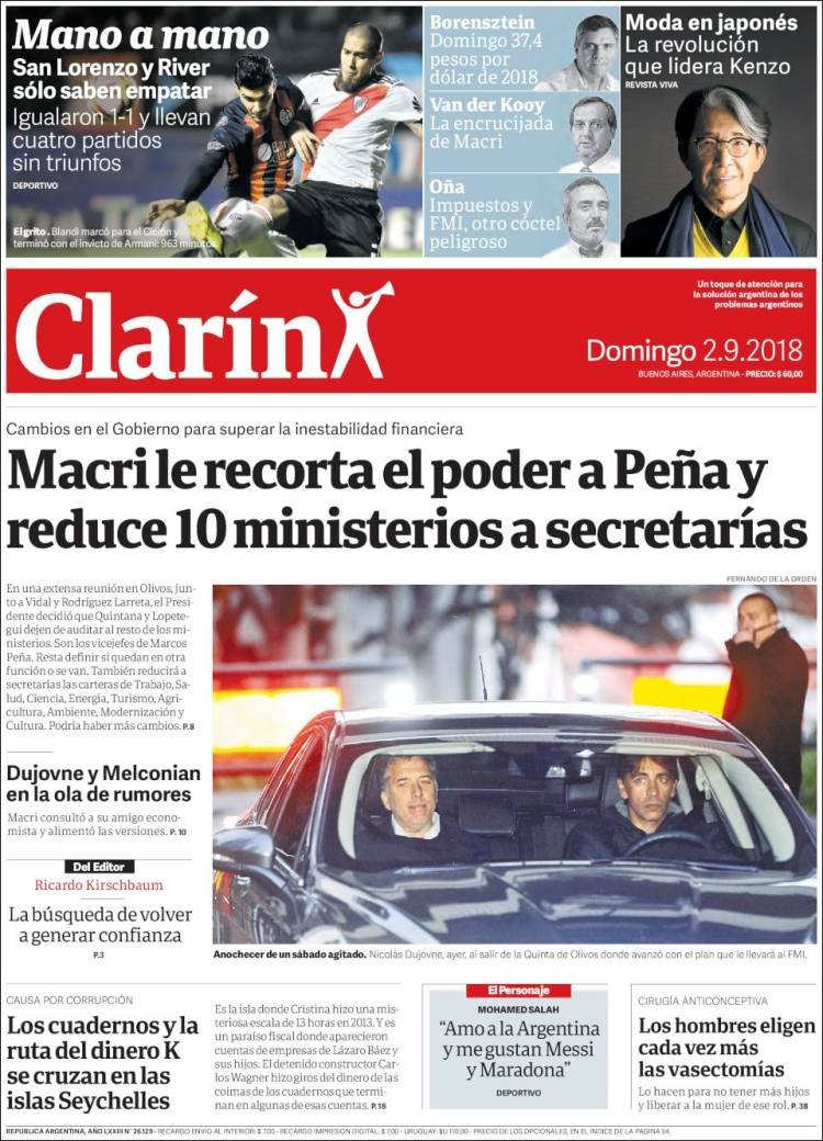 A continuación, compartimos las tapas de los principales diarios de Buenos Aires del domingo 2 de septiembre. El ajuste que decidió Macri en Olivos y que será anunciado mañana es uno de los principales temas.