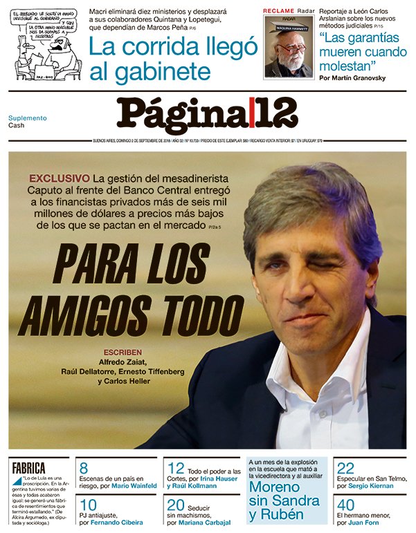 Una vez más, Página 12 volvió a acertar con otro notable informe sobre la gestión financiera del Gobierno, plagada de conflictos de intereses, funcionarios que no se sabe de “que lado de la mesa están” y, sobre todo, un enorme costo económico a pagar por todos los argentinos cuyo alcance aún no se conoce en su totalidad.