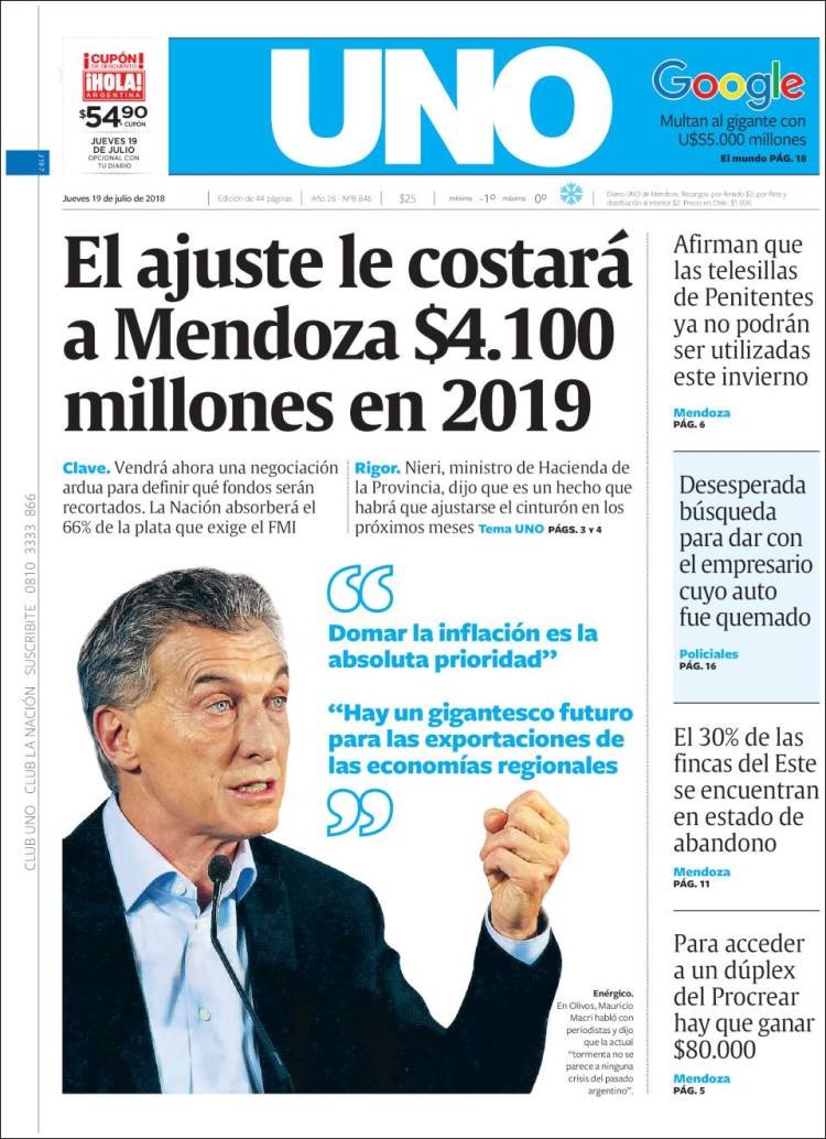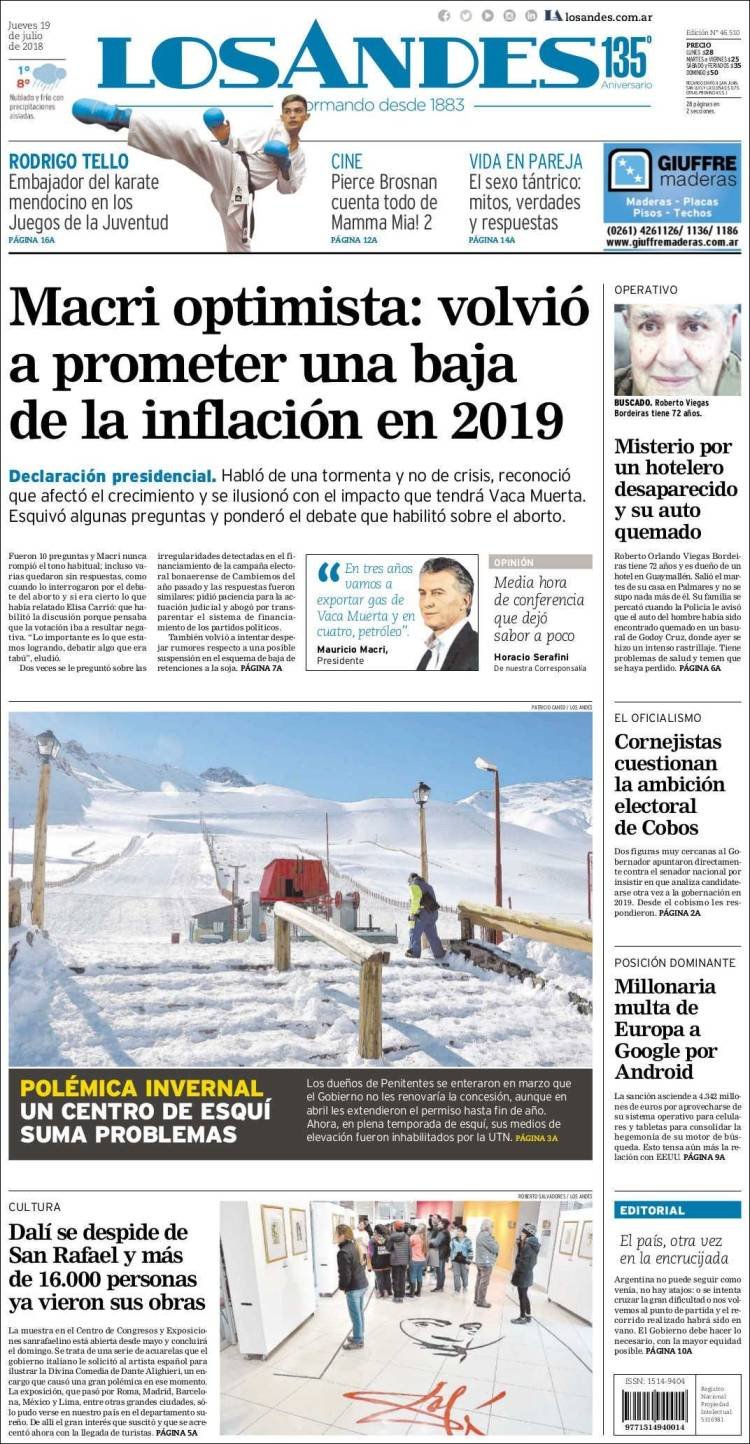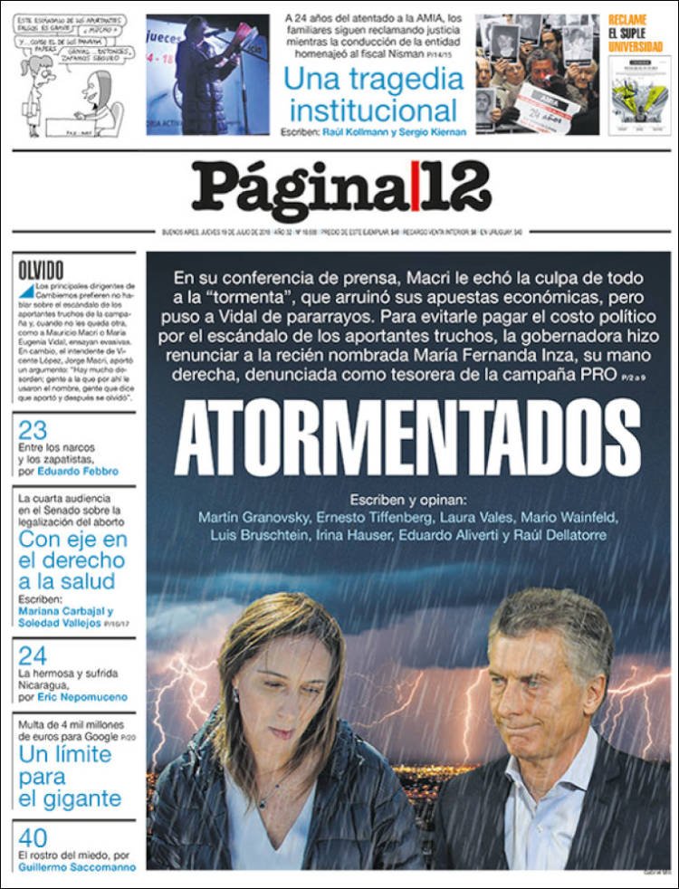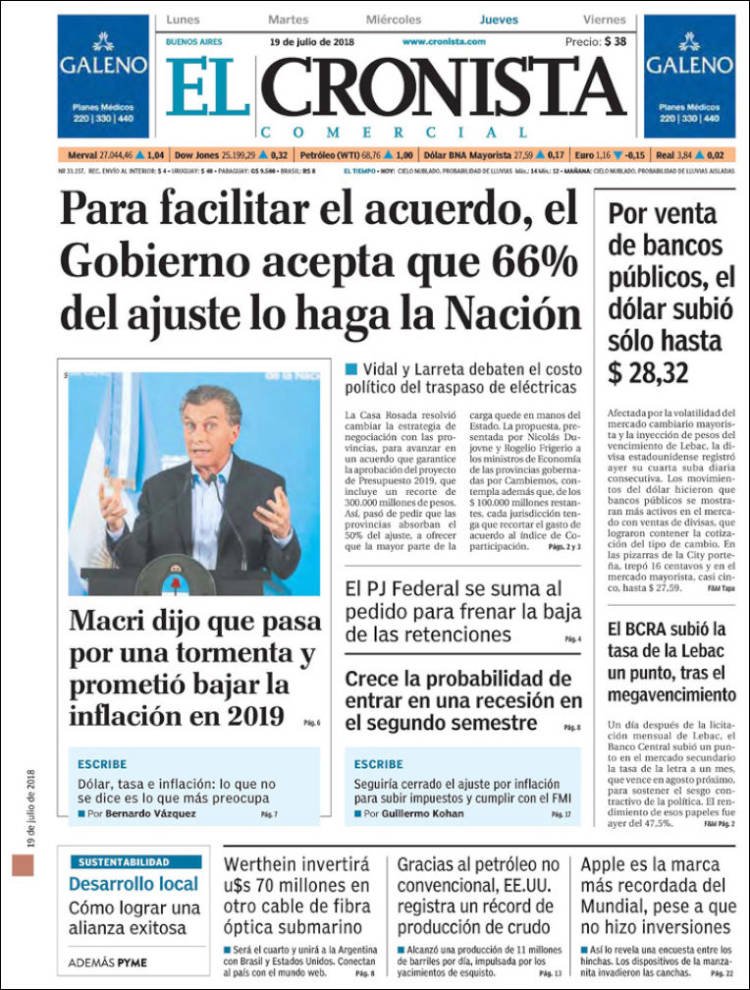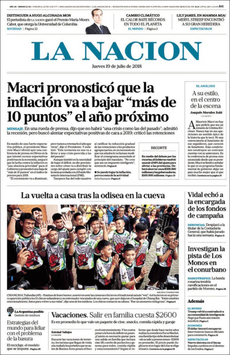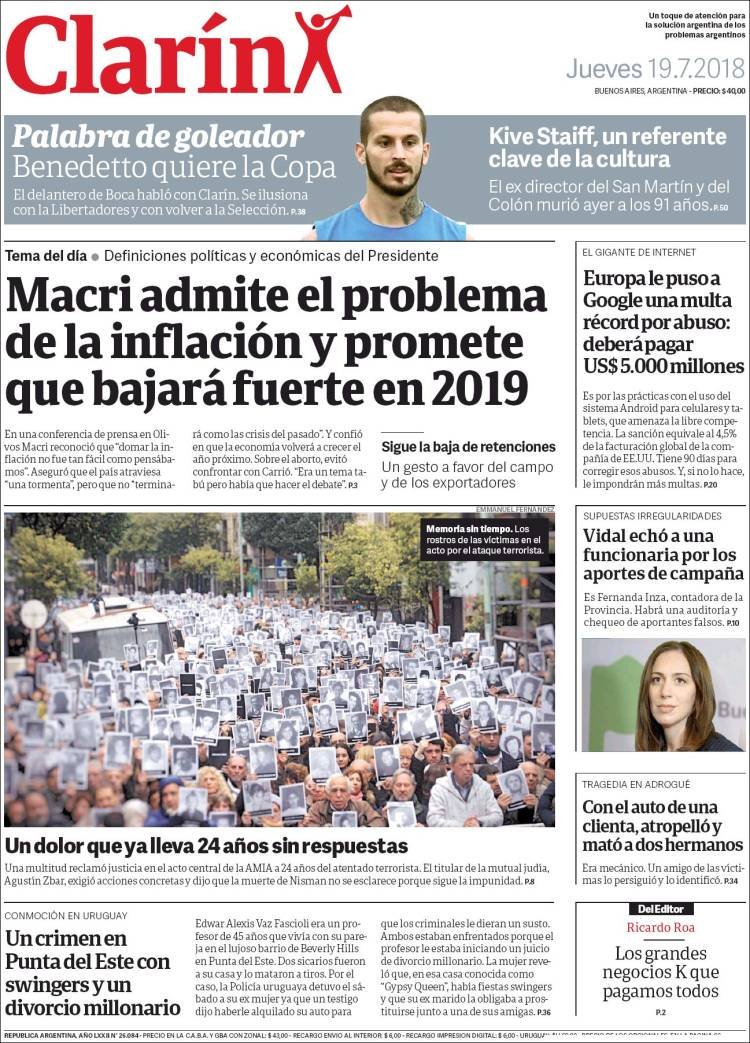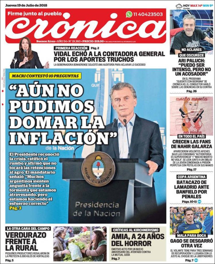 Las tapas del jueves 19/7: Macri ratificó el rumbo y reconoció que “la tormenta” de la inflación no bajará este año