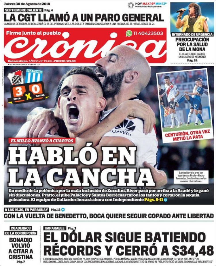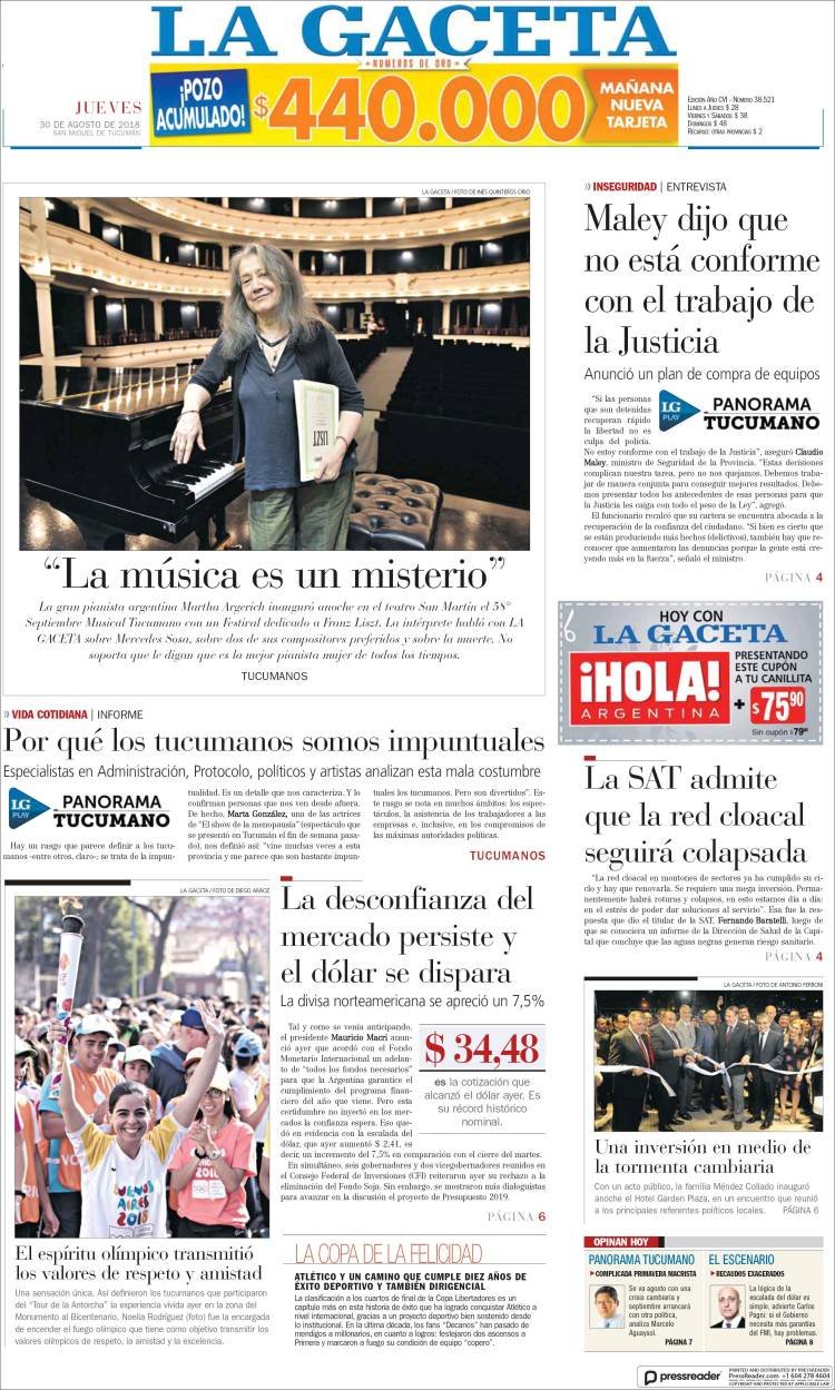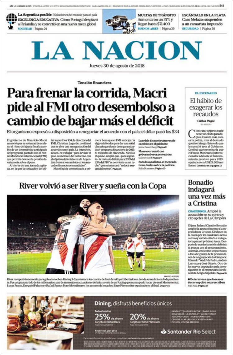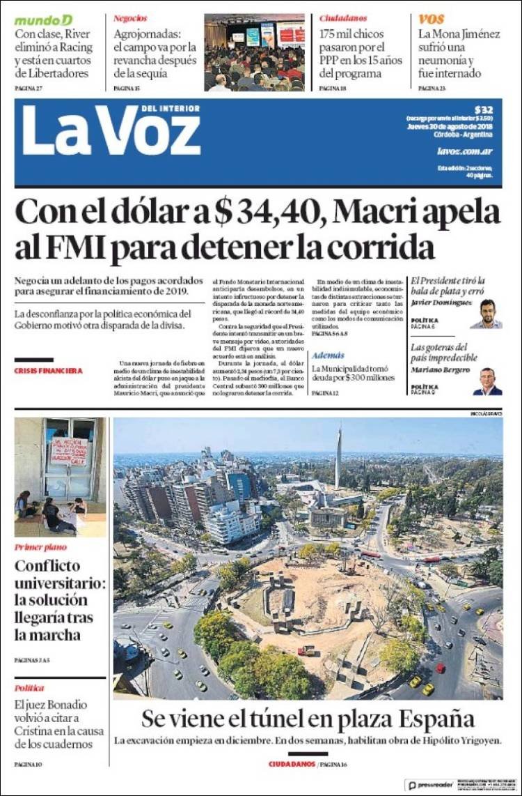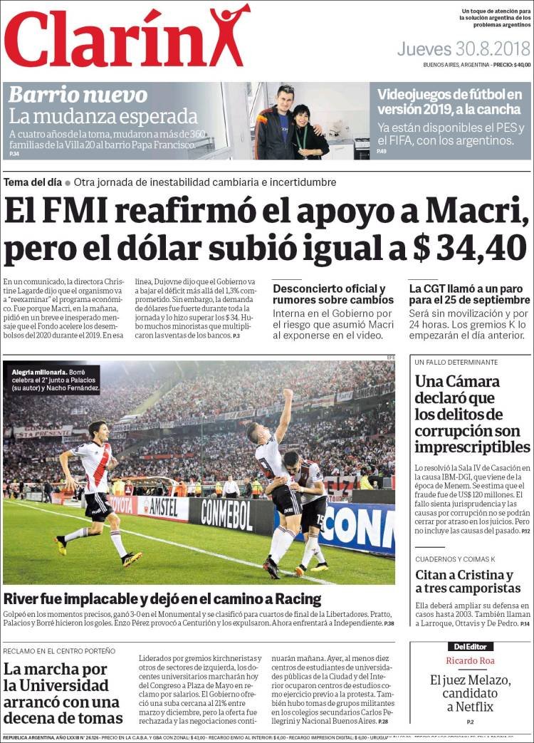 A continuación reproducimos las tapas de los principales diarios del país. La nueva fiebre del dolar generó un nuevo salto de la divisa norteamericana. Ninguna aclaración o acuerdo parece generar la suficiente confianza en el Gobierno de Cambiemos, que parece no encontrarle la vuelta para cautivar a los inversores.