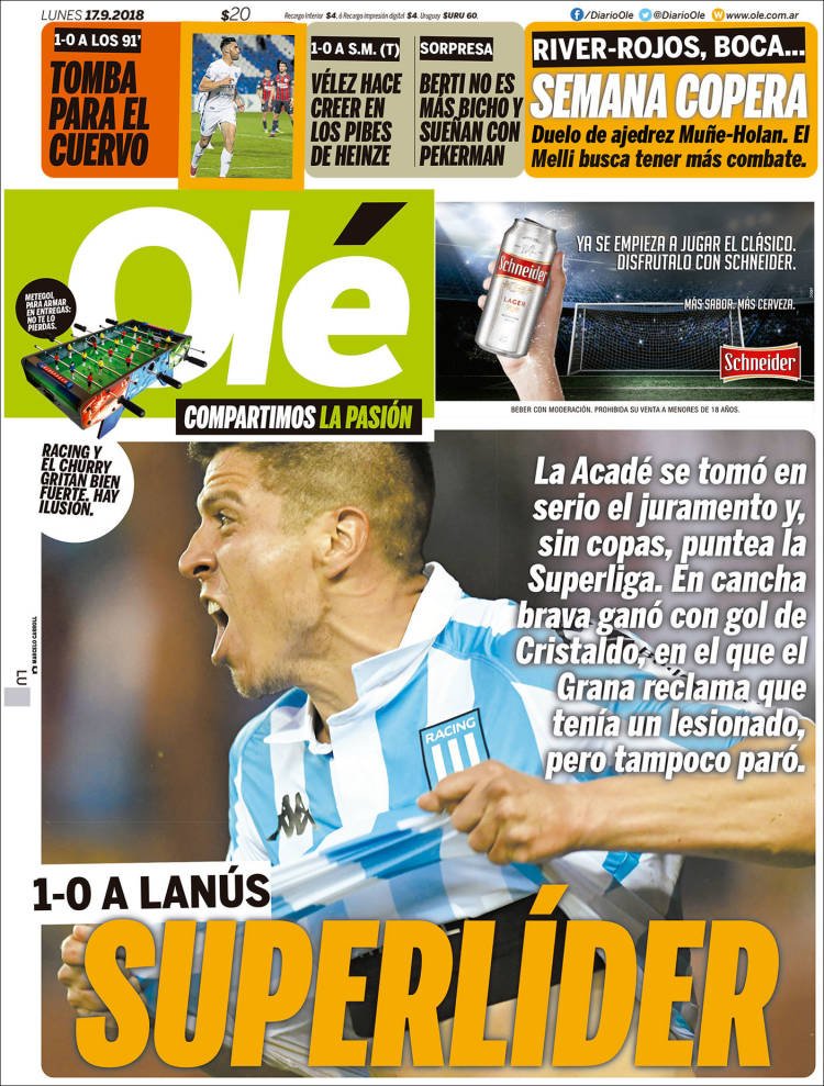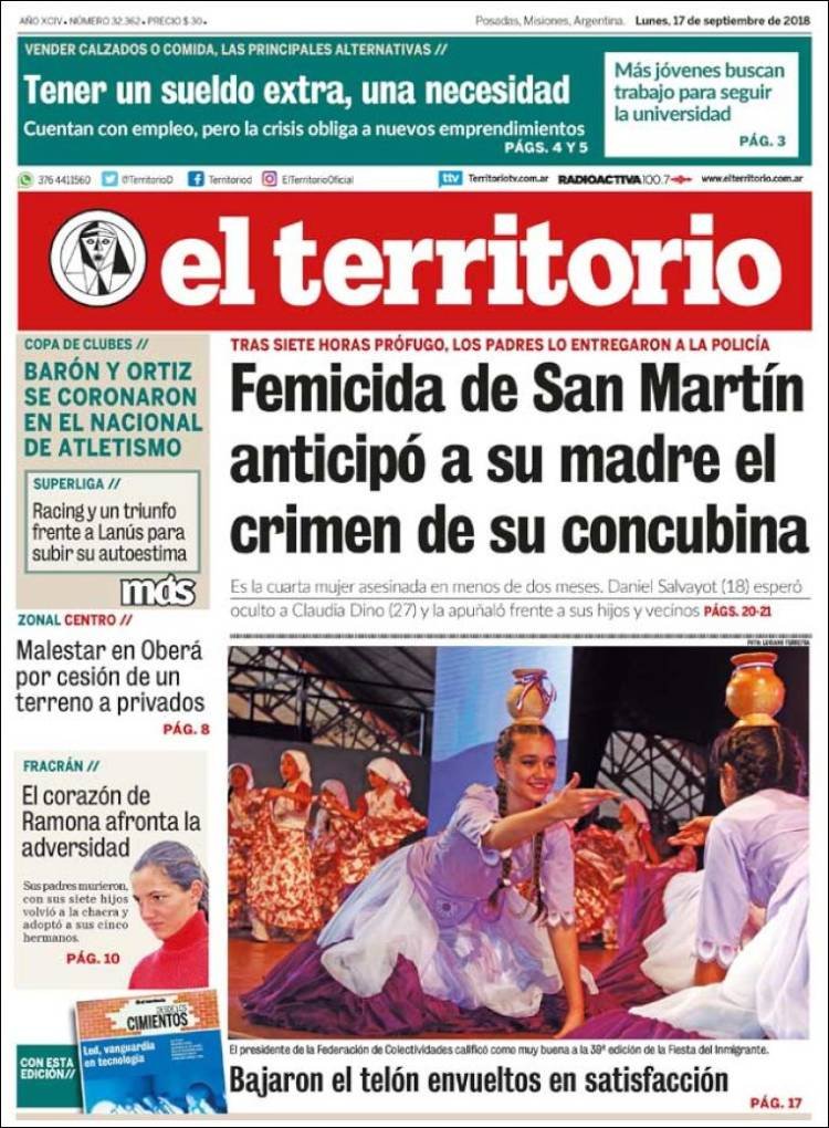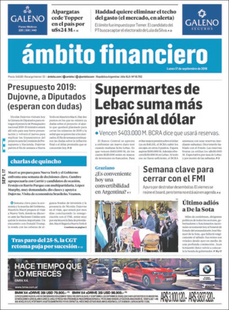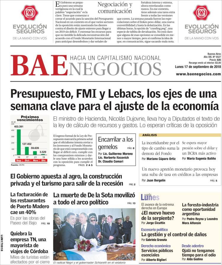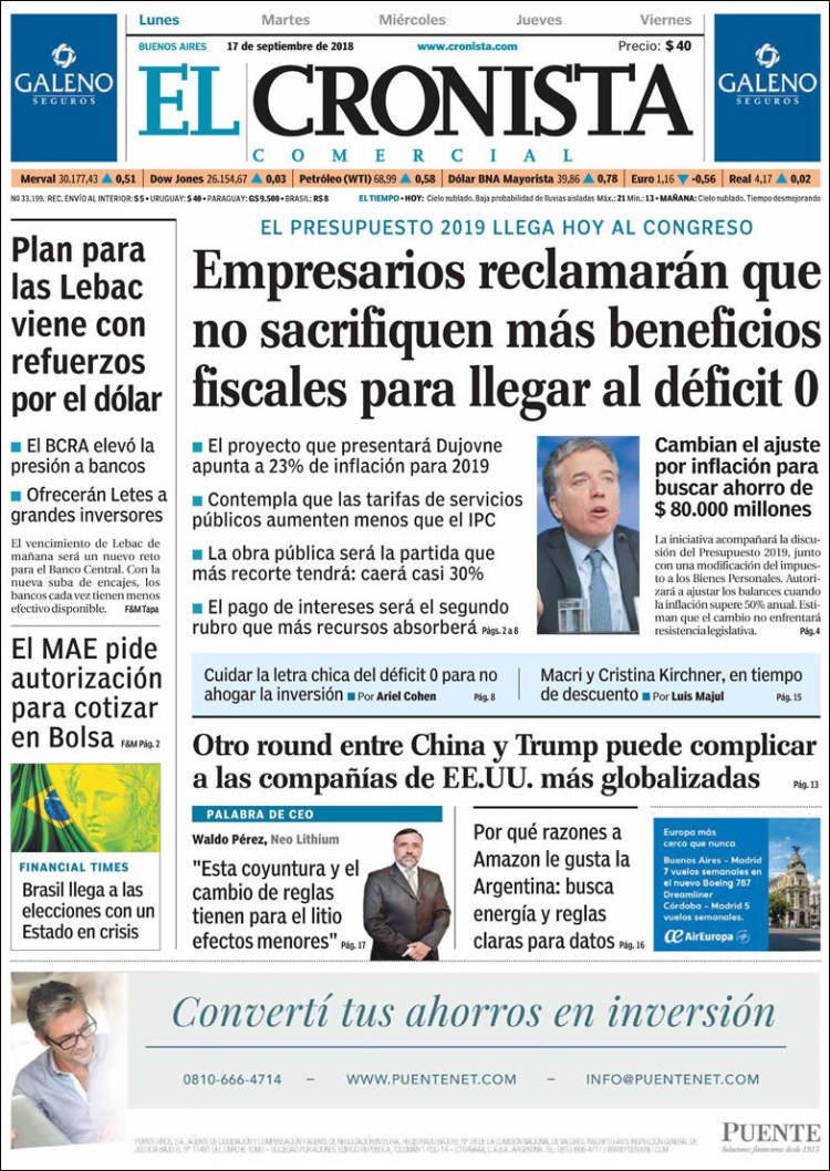 A continuación, repasamos las tapas de los diarios del lunes 17 de septiembre. La presentación del Presupuesto 2019 en el Congreso, la despedida al ex gobernador José Manuel de la Sota y la previa a un martes con un vencimiento importante de Lebacs son algunos de los temas principales.