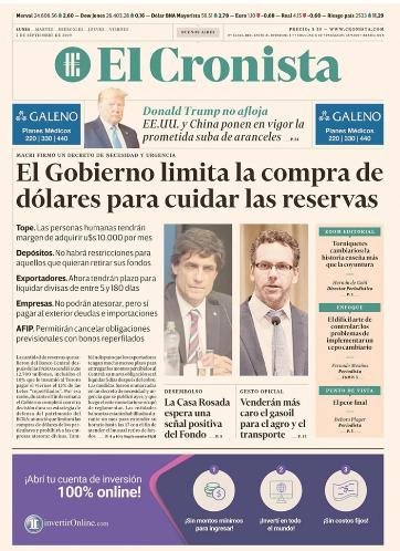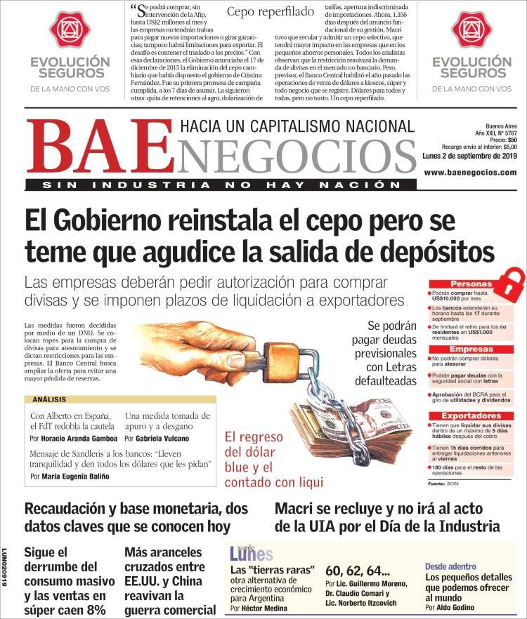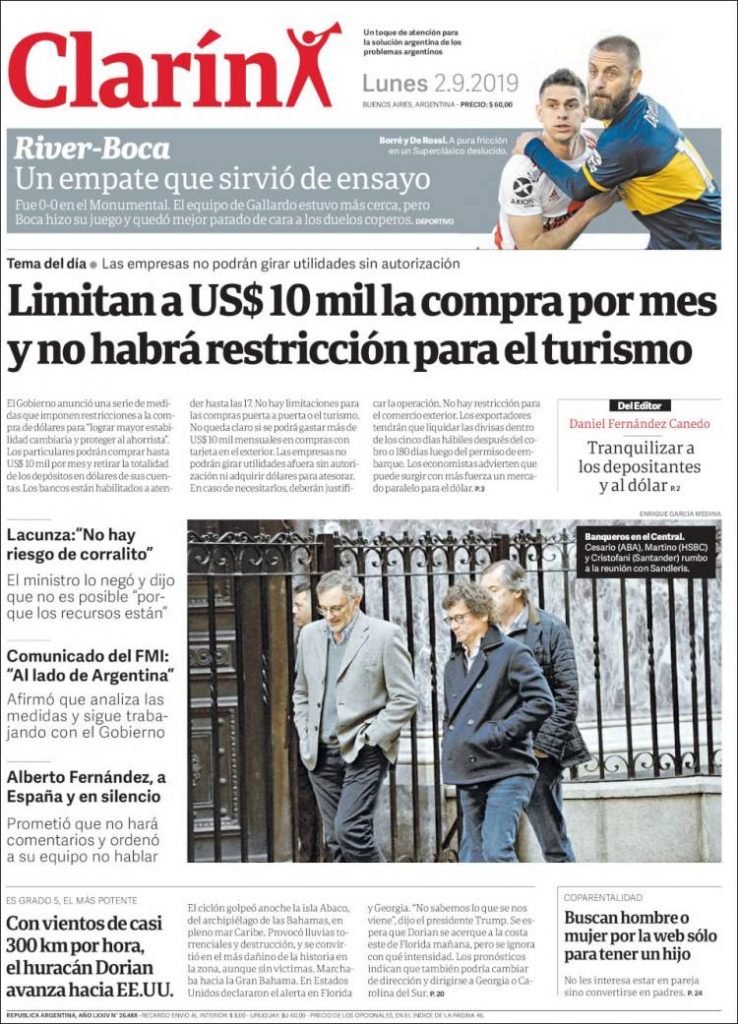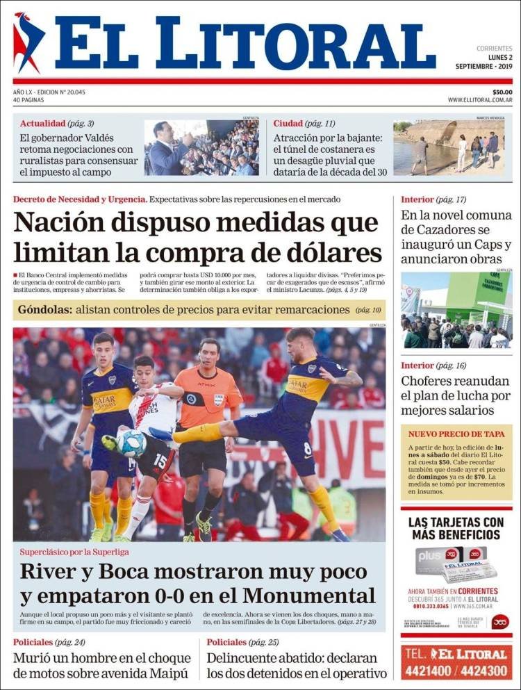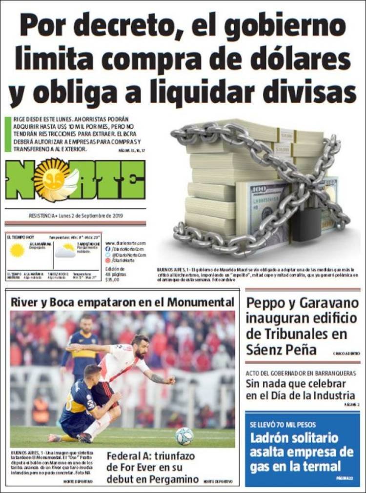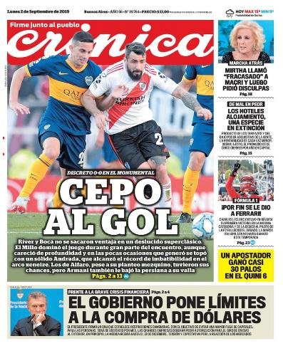 A continuación, repasamos las tapas de los diarios del lunes 2 de septiembre. El tema excluyente fue el regreso de las restricciones cambiarias (cepo), que opacaron a un superclásico sin emociones.