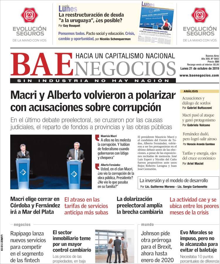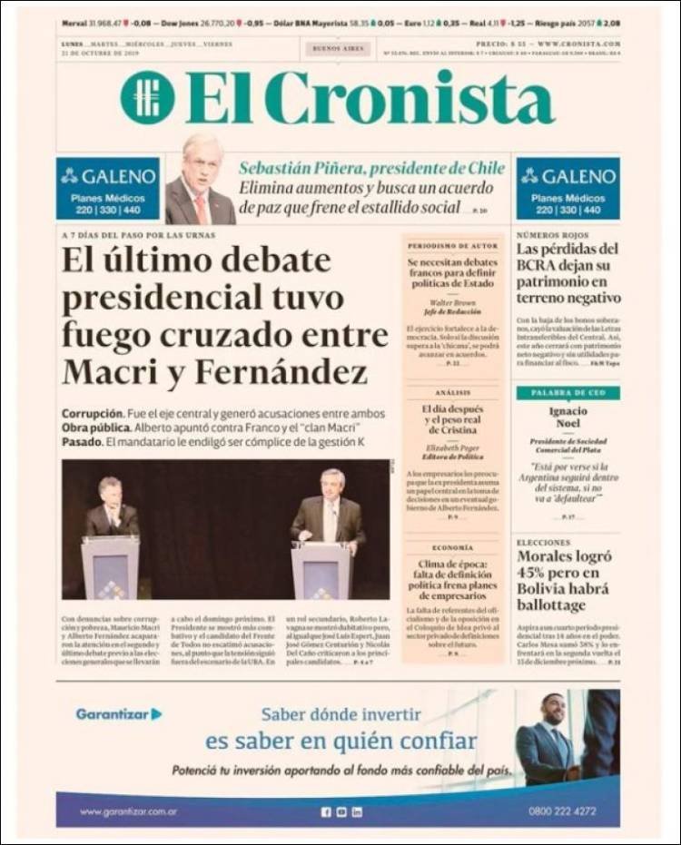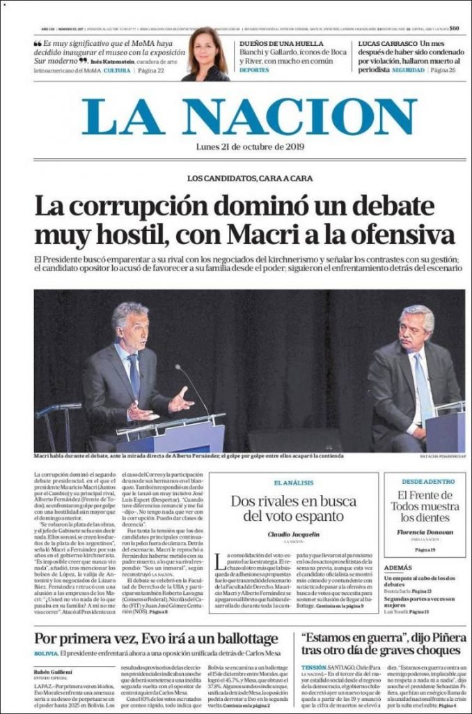 A continuación, repasamos las tapas de los diarios del lunes 21 de octubre. El segundo debate de candidatos a presidente, el tema principal.