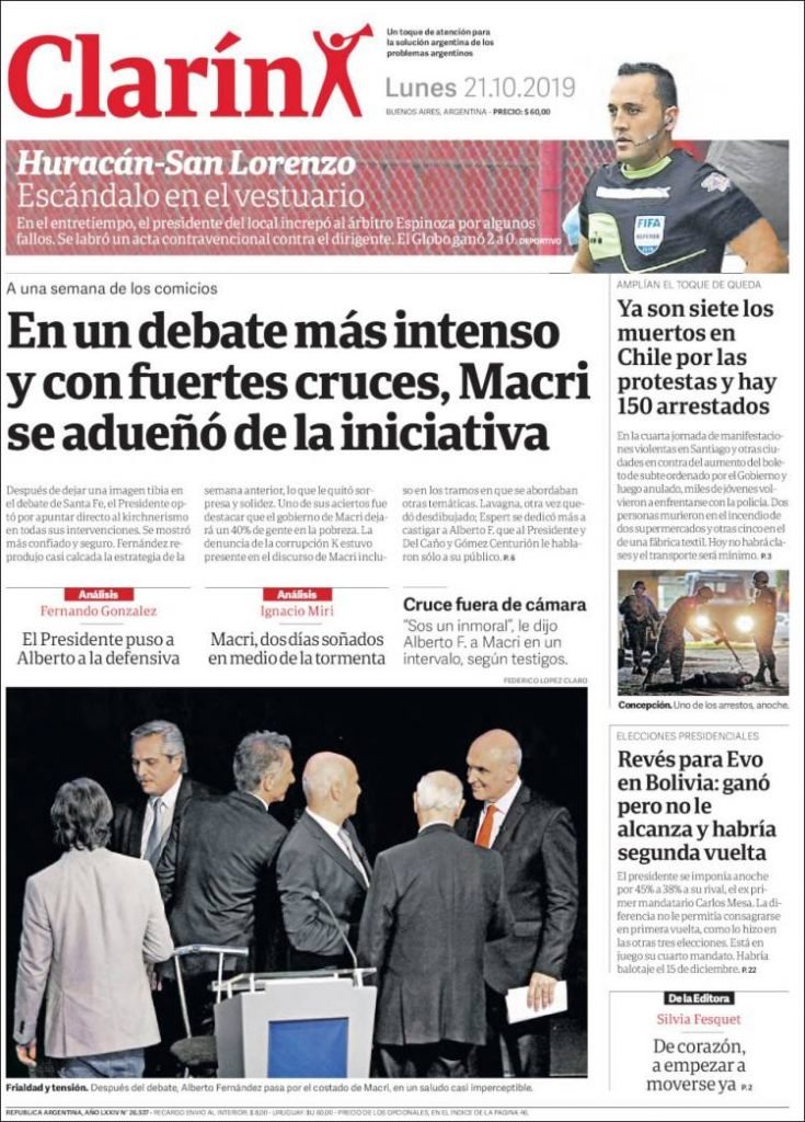 Las tapas del lunes 21: Un debate más picante y la escalada de la violencia en Chile