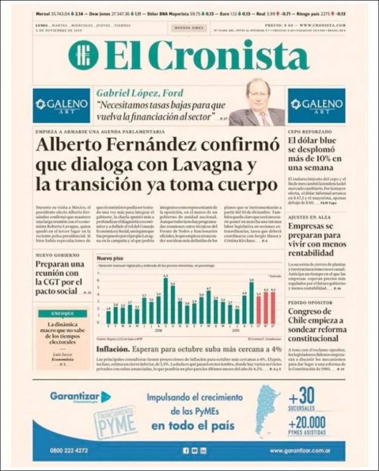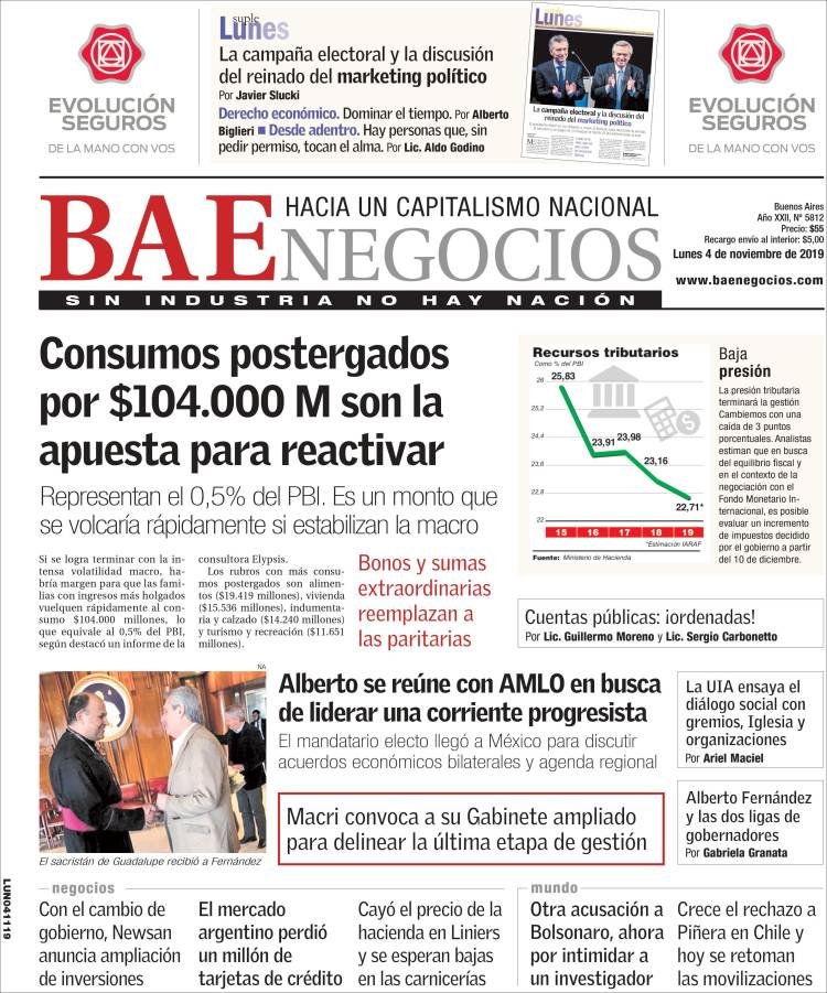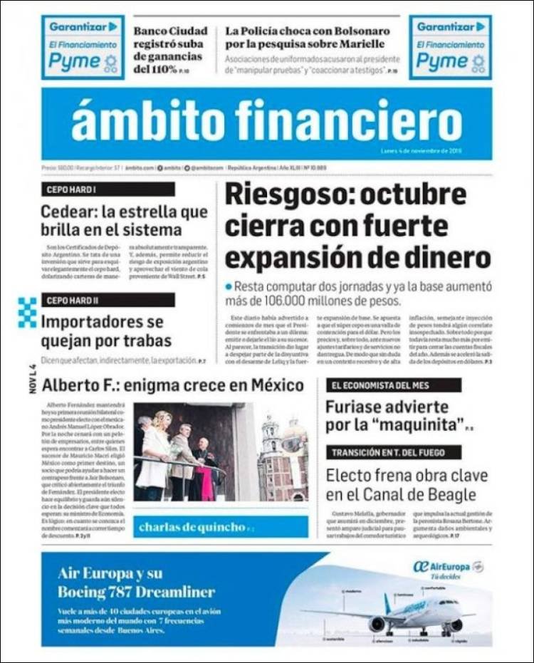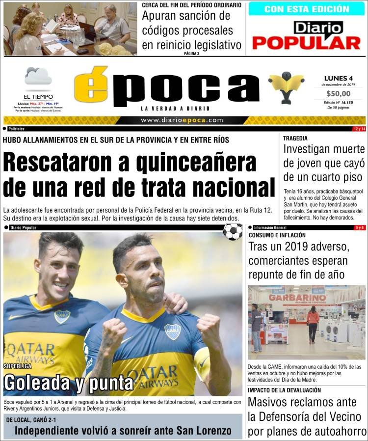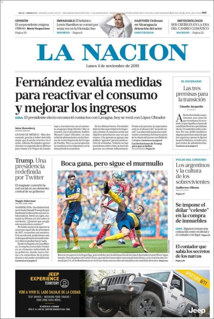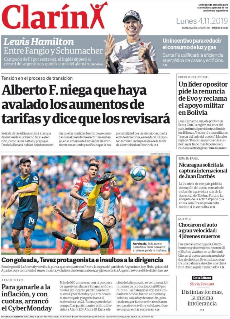 A continuación, las tapas de los diarios del lunes 4 de noviembre. El presidente electo Alberto Fernández se encuentra en México, mientras delinea sus primeras medidas. Además, Boca volvió a la Bombonera y goleó a Arsenal. Una sonrisa tras la eliminación de la Libertadores a manos de River.