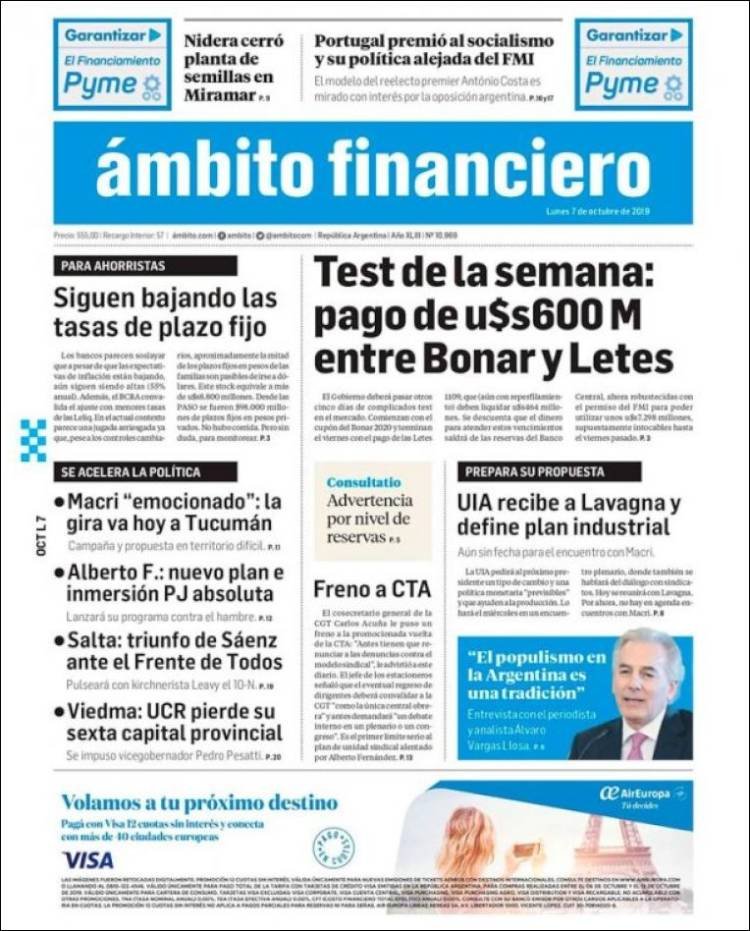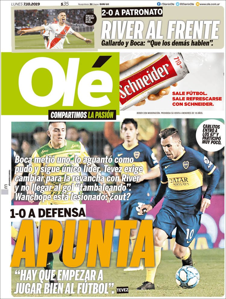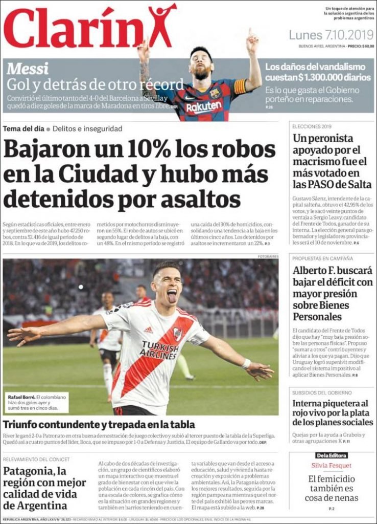 A continuación, repasamos las tapas de los diarios del lunes 7 de octubre. River y Boca ganaron sus respectivos partidos. Además, un peronista no alineado con el kirchnerismo se impuso en las primarias en Salta, donde la elección a gobernador será el 10 de noviembre.