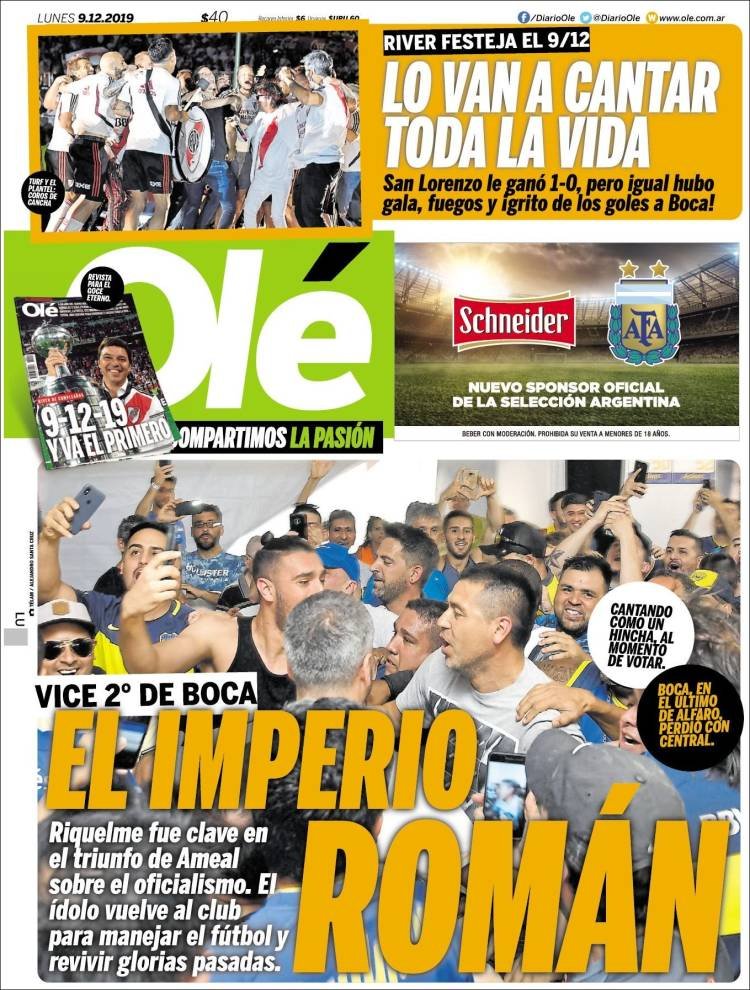 A continuación, repasamos las tapas de los diarios del lunes 9 de diciembre. El triunfo de Amor Ameal, con Riquelmen, en Boca y el abrazo entre el Presidente saliente y el entrante en Luján.