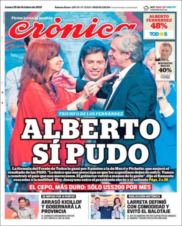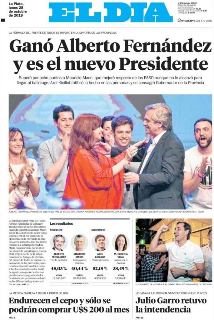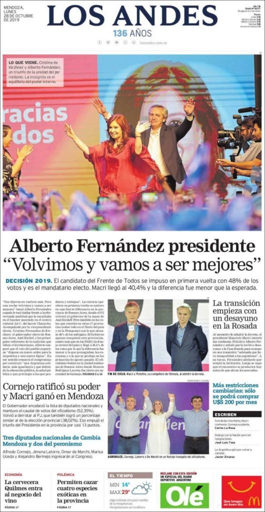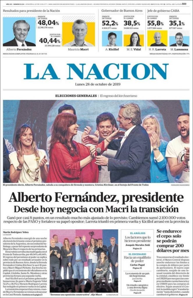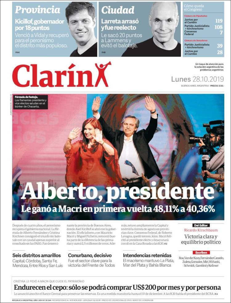 A continuación, repasamos las tapas de los diarios del lunes 28 de octubre, donde el tema excluyente es el triunfo de Alberto Fernández en primera vuelta. Además, es interesante ver cómo resolvió cada diario su portada y qué lugar le dio a la segunda de la fórmula, la ex presidenta y ahora nueva vice, Cristina Fernández. El endurecimiento del cepo, otro tema secundario pero presente en todos los matutinos hoy.