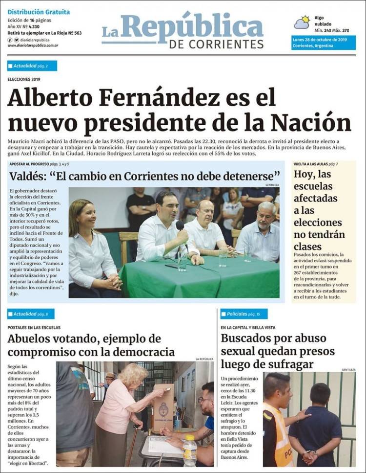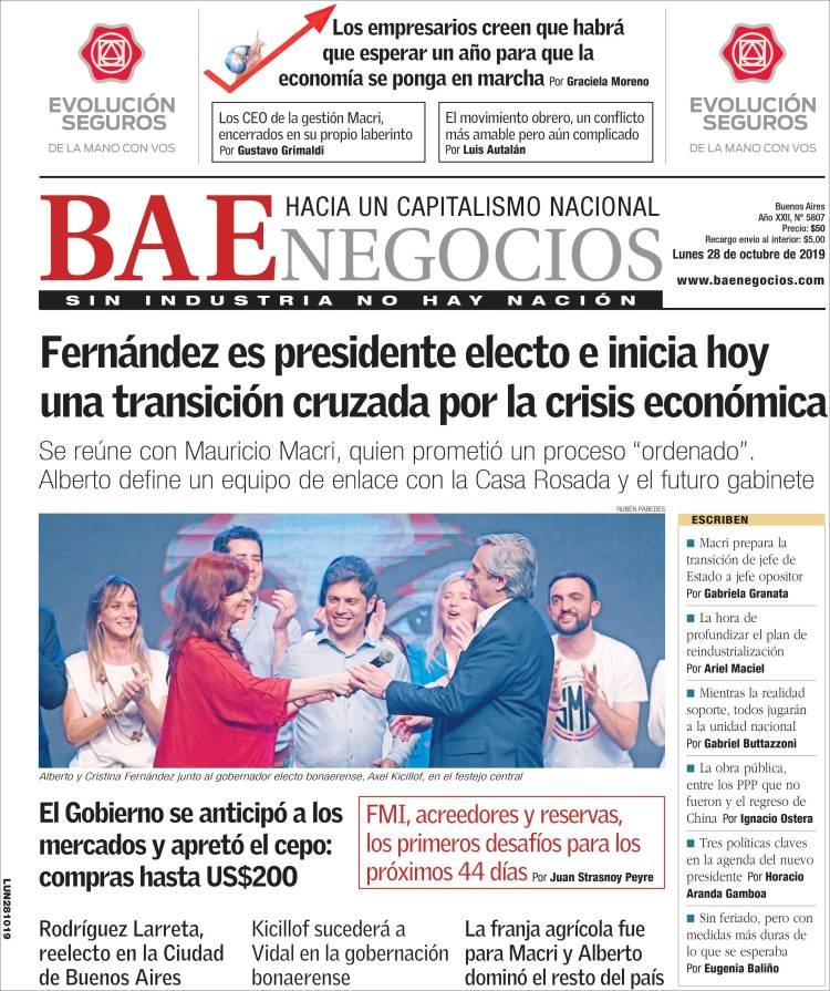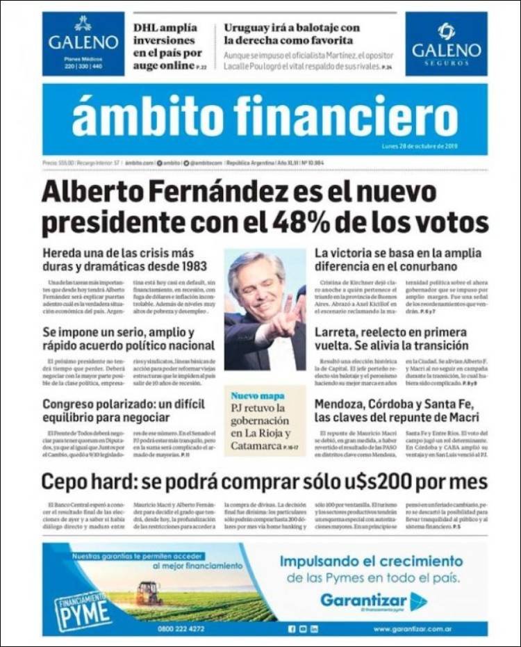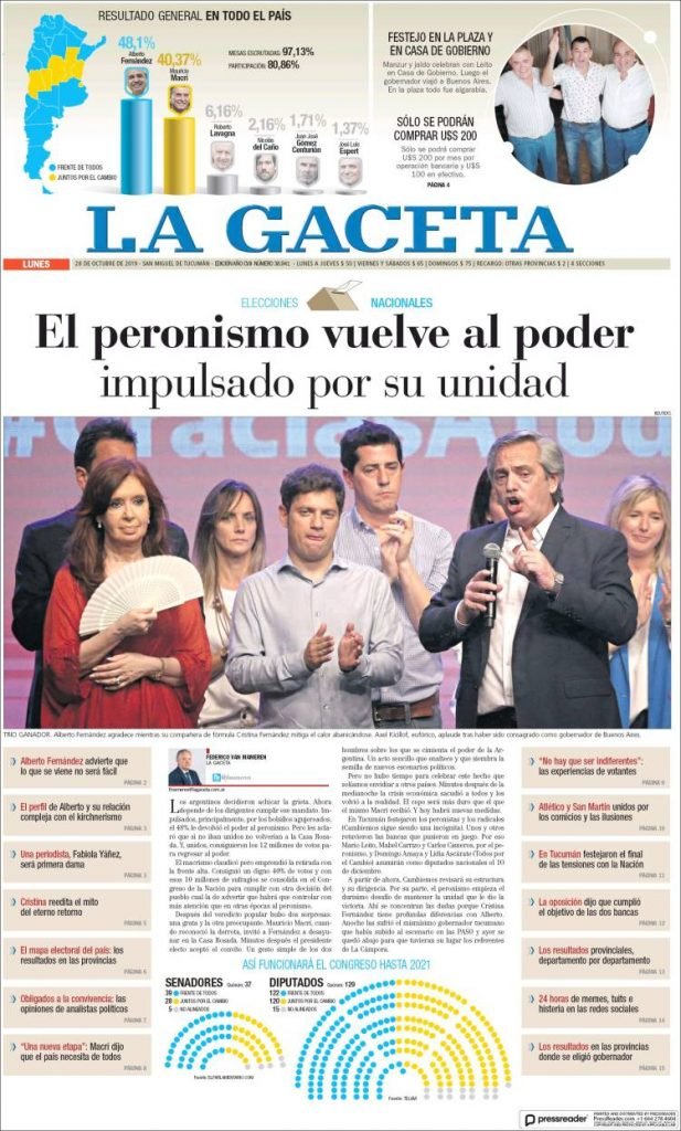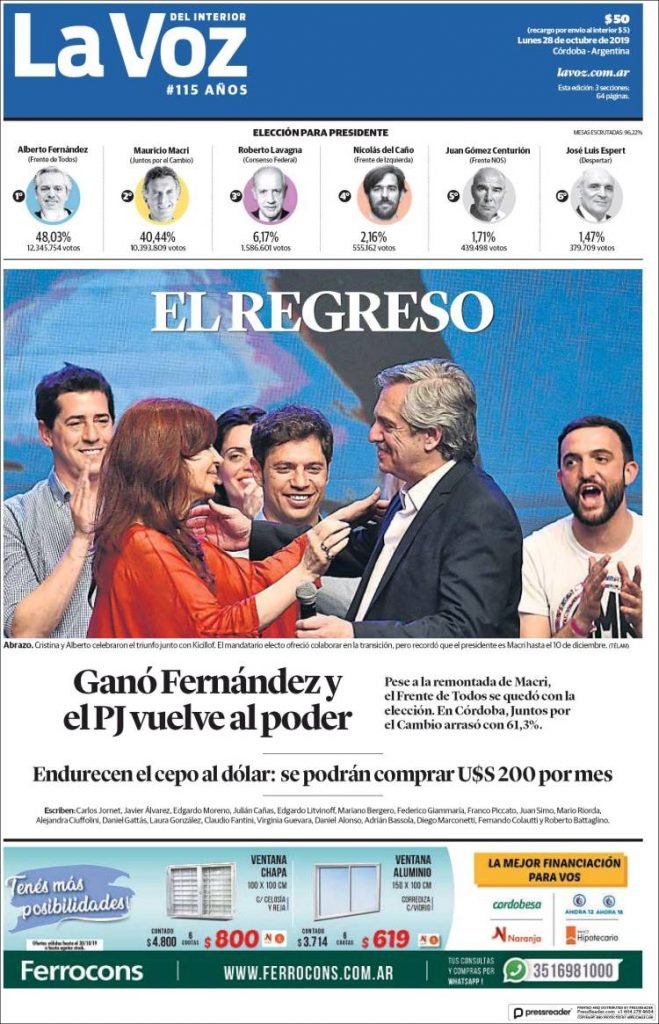 A continuación, repasamos las tapas de los diarios del lunes 28 de octubre, donde el tema excluyente es el triunfo de Alberto Fernández en primera vuelta. Además, es interesante ver cómo resolvió cada diario su portada y qué lugar le dio a la segunda de la fórmula, la ex presidenta y ahora nueva vice, Cristina Fernández. El endurecimiento del cepo, otro tema secundario pero presente en todos los matutinos hoy.