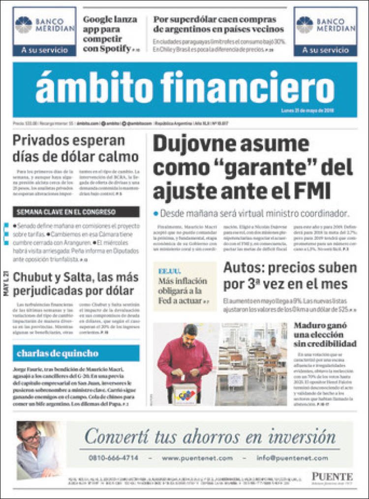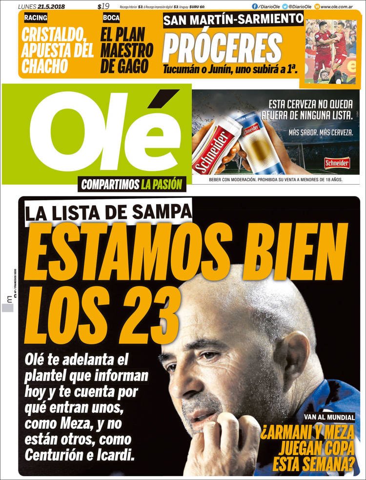 A continuación, repasamos las tapas del lunes 21 de mayo de los principales diarios de Buenos Aires y Misiones. Algunos de los temas principales es el anuncio de los 23 futbolistas que Sampaoli llevará a Rusia 2018 y el análisis por la designación de Nicolás Dujovne como ministro coordinador del Gabinete Económico.