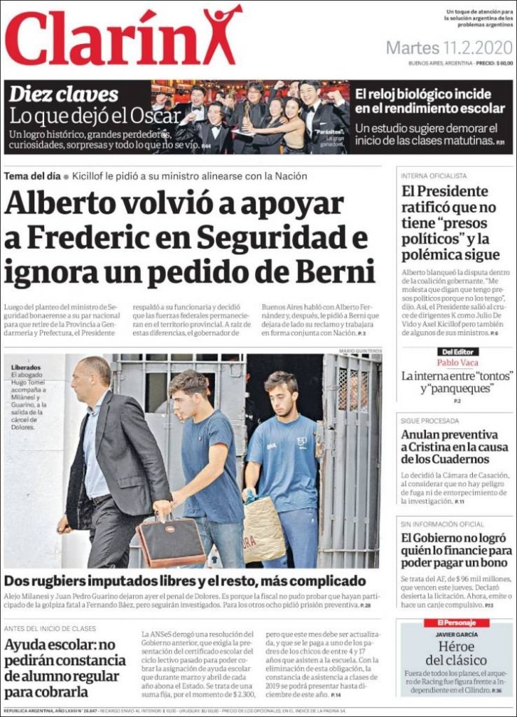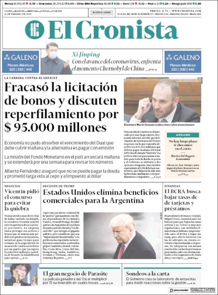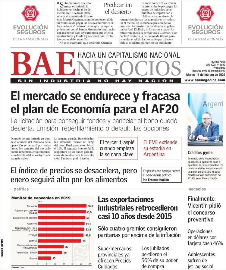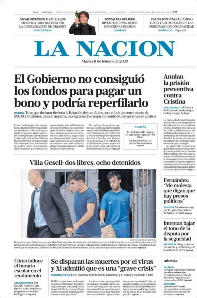 A continuación, repasamos las portadas del martes 11 de febrero. El Gobierno Nacional no pudo renovar un bono por 95.000 millones de pesos que vence este jueves. Debe decidir si emite para cancelarlo, o lo reperfila (patea adelante el vencimiento).