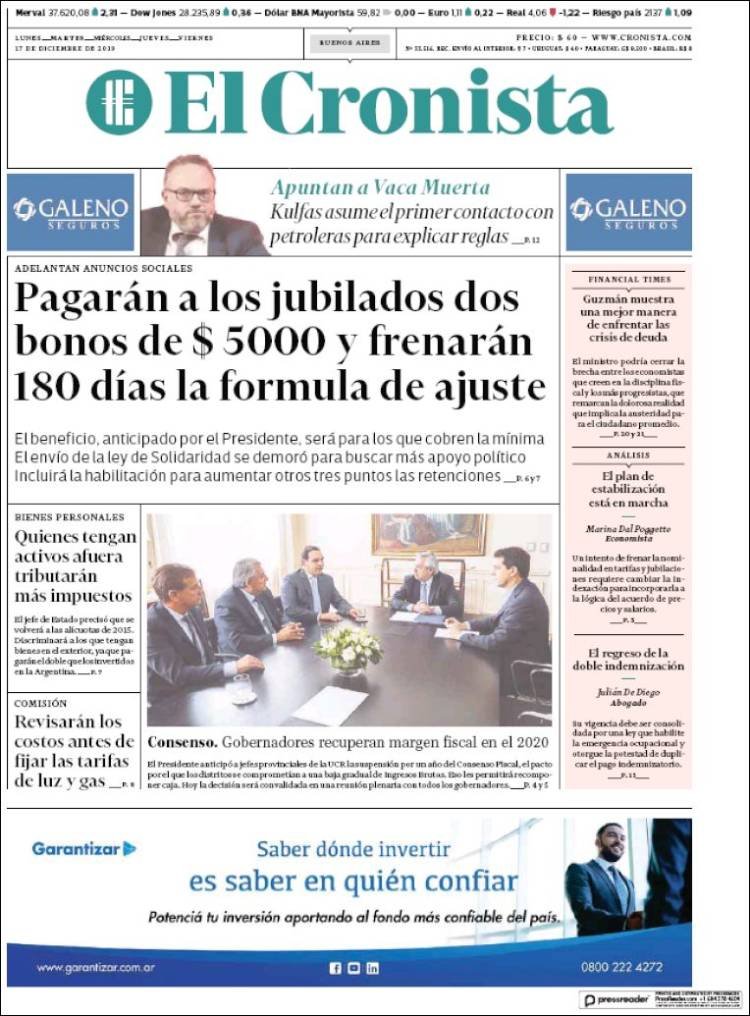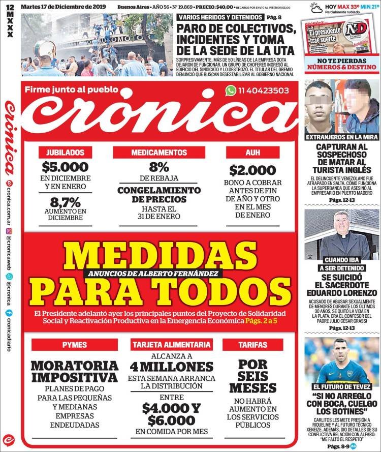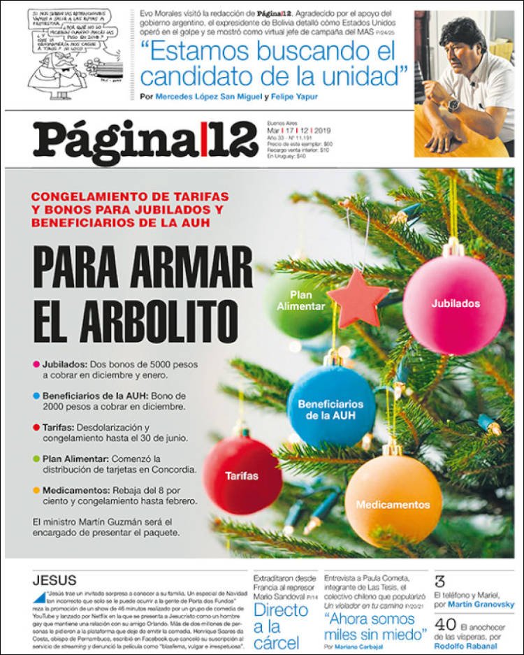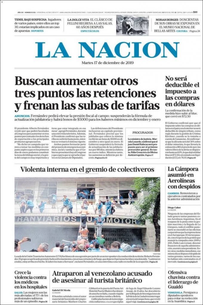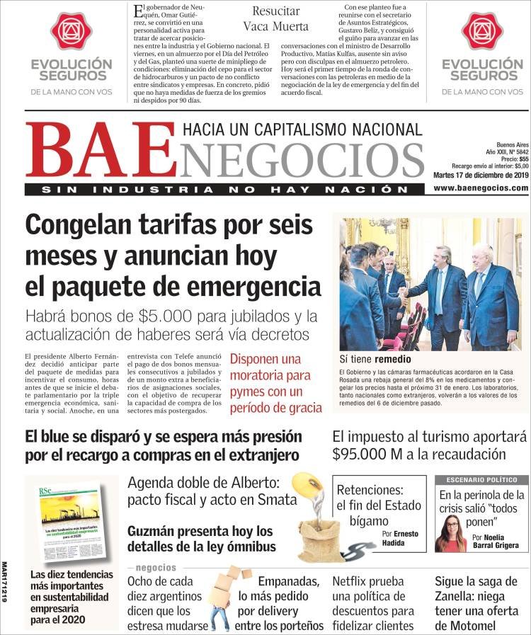 A continuación, repasamos las tapas de los diarios del martes 17 de diciembre. Se van conociendo más medidas de la ley ómnibus que el Gobierno enviará al Congreso para aprobar antes de fin de año o en los primeros días del 2020. Incluye una suspensión del mecanismo de actualización automática de jubilaciones por seis meses.