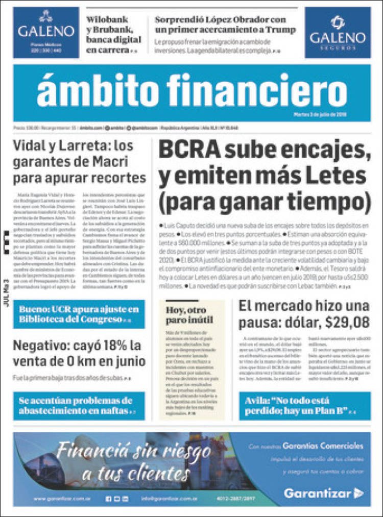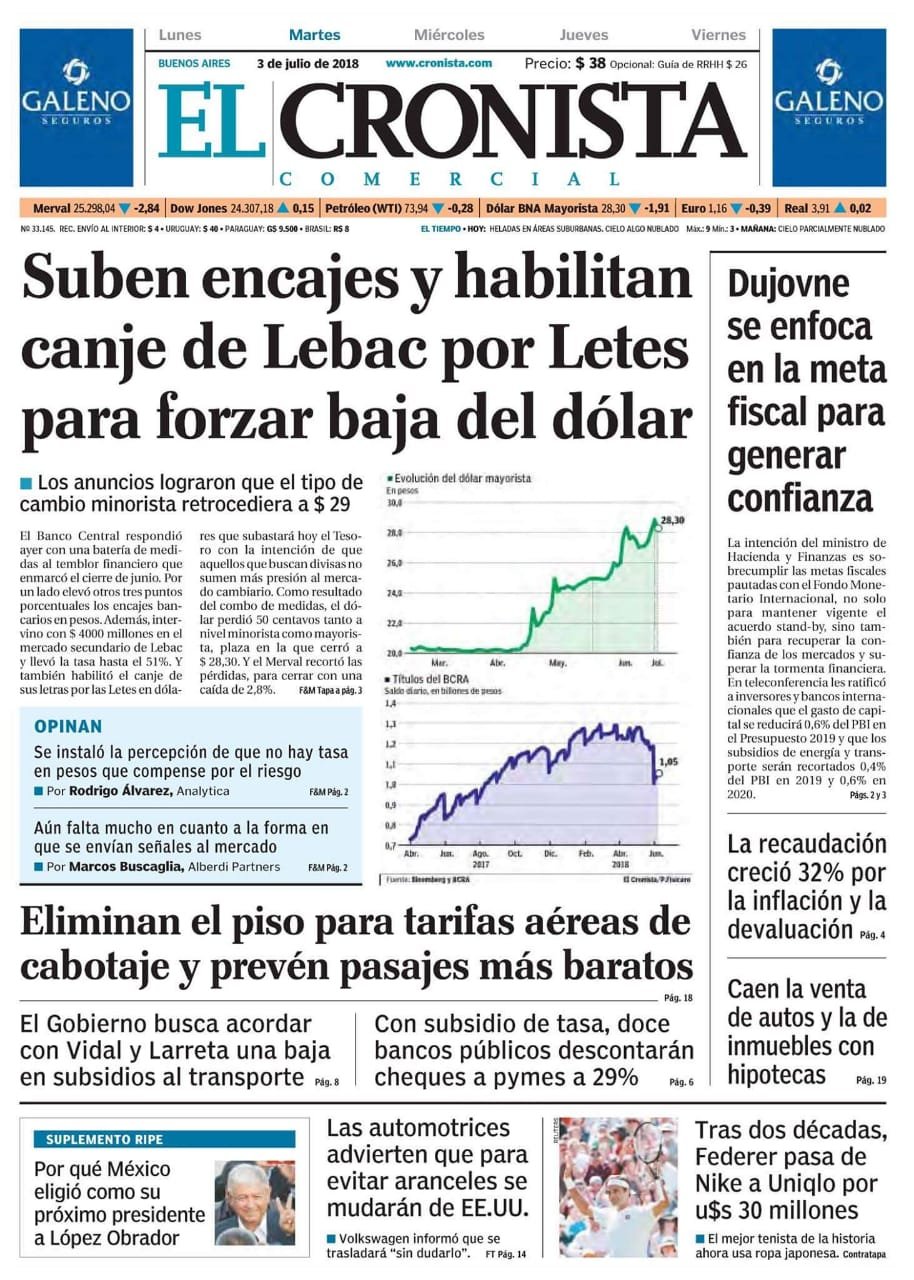 A continuación reproducimos las tapas de los principales diarios del país. El BCRA propone nuevas medidas para frenar la devaluación del peso, suben encajes y emiten más Letes.