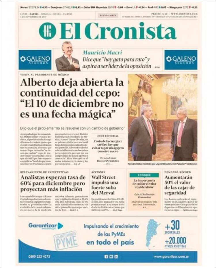 A continuación, repasamos las tapas de los diarios del martes 5 de noviembre. Uno de los temas principales son los comentarios de Alberto Fernández sobre la posible continuidad del cepo y la desdolarización de las tarifas de los servicios públicos.