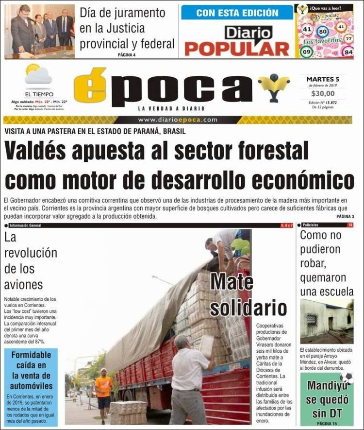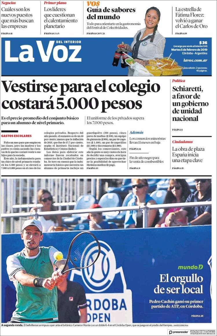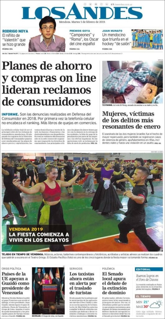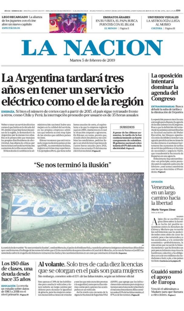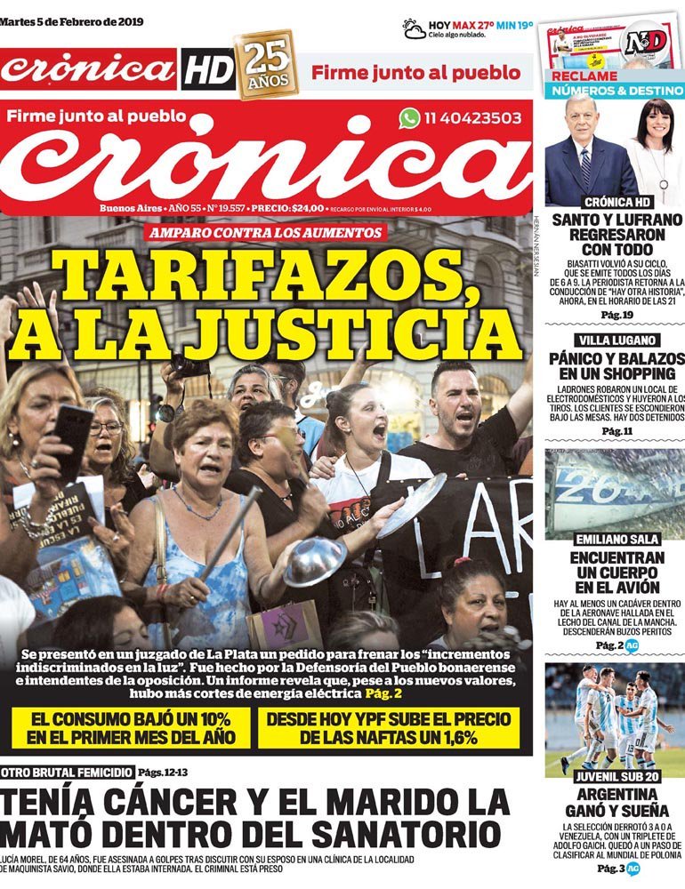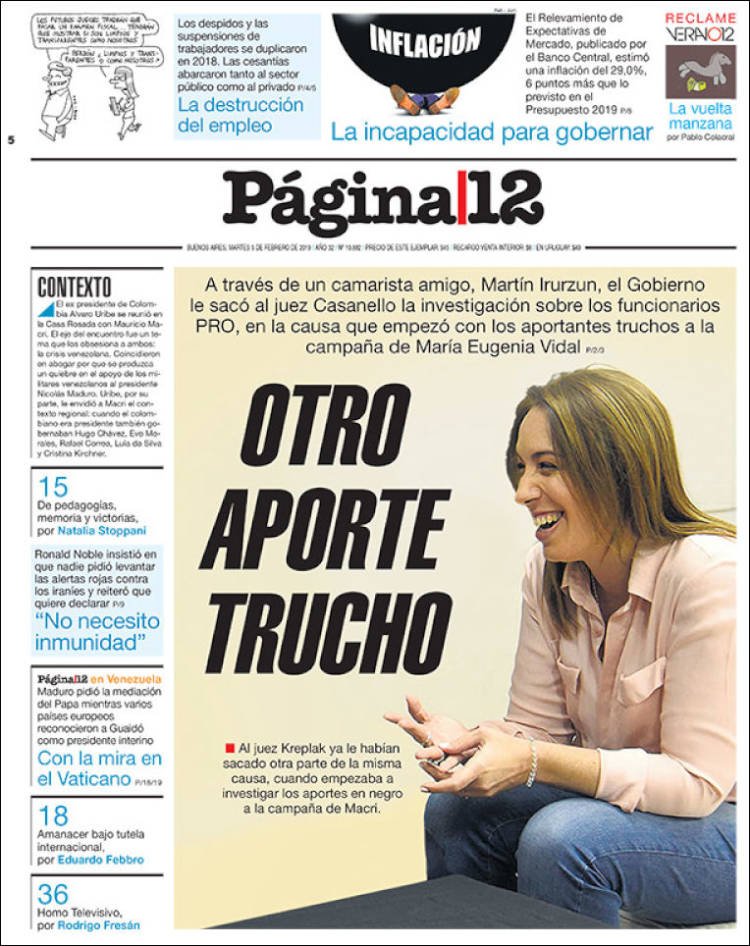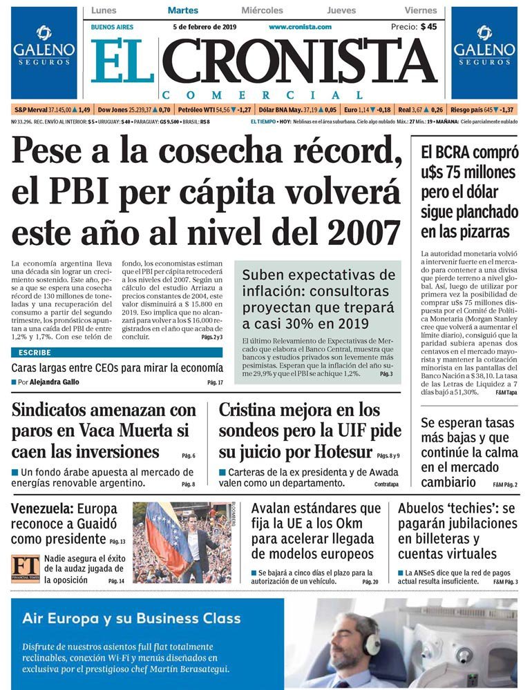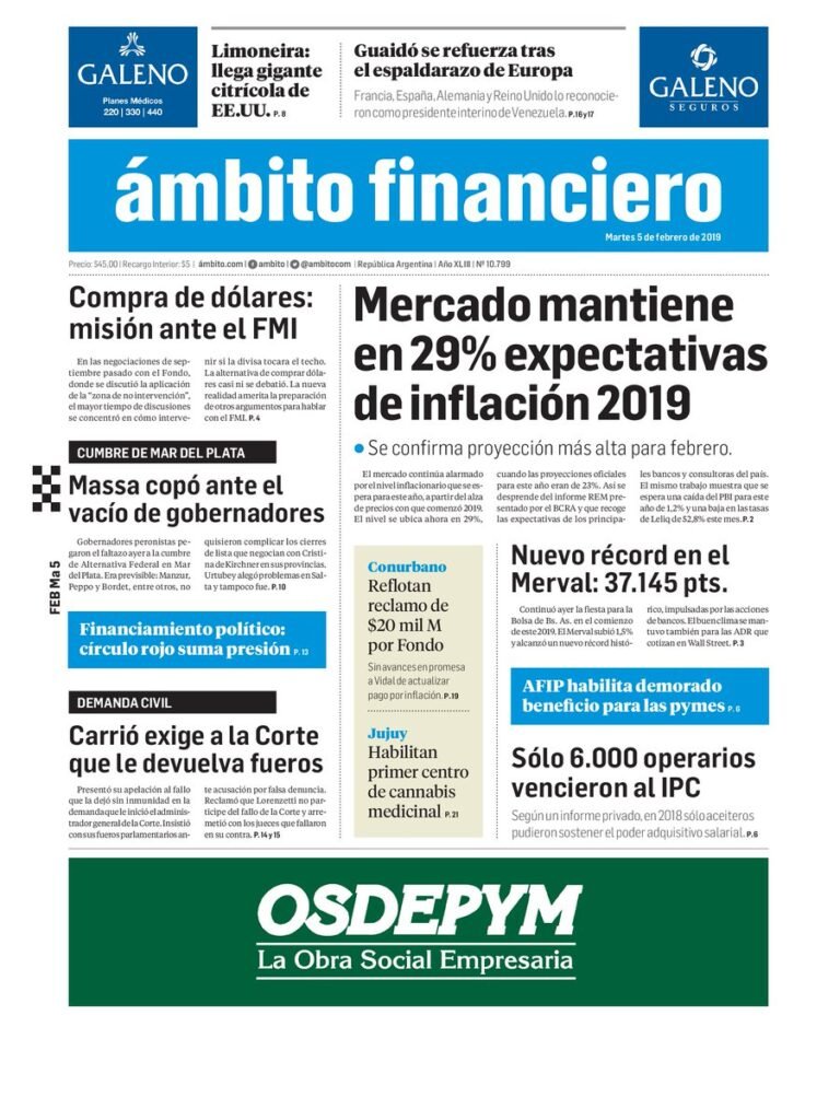A continuación reproducimos las tapas de los principales diarios del país. Las expectativas de la inflación por parte de los economistas muestran una tendencia similar a la del año pasado, con un promedio del 30 por ciento para este 2019. Además ven un dolar a 48 pesos.