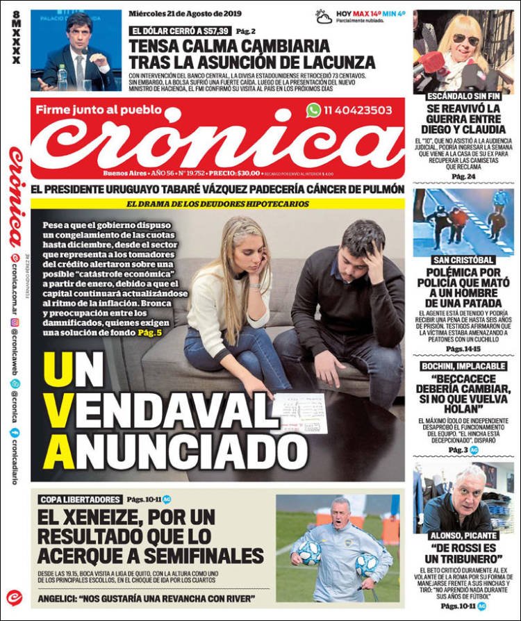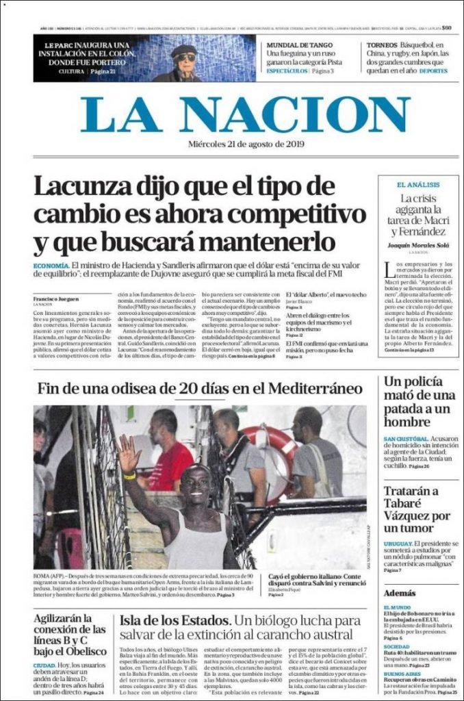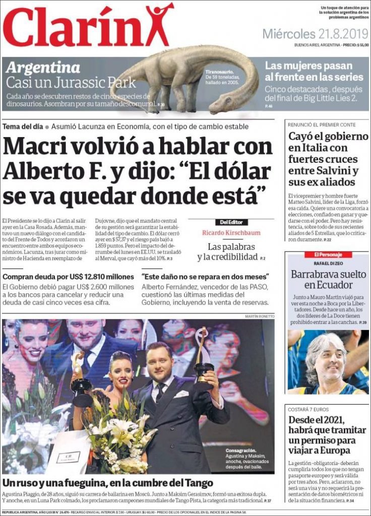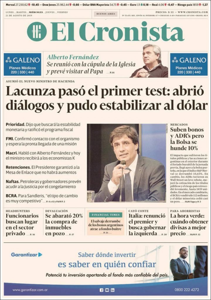 A continuación, repasamos las tapas de los diarios del miércoles 21 de agosto. Los comentarios del recién asumido Hernán Lacunza como ministro de Hacienda son uno de los temas principales en las portadas.