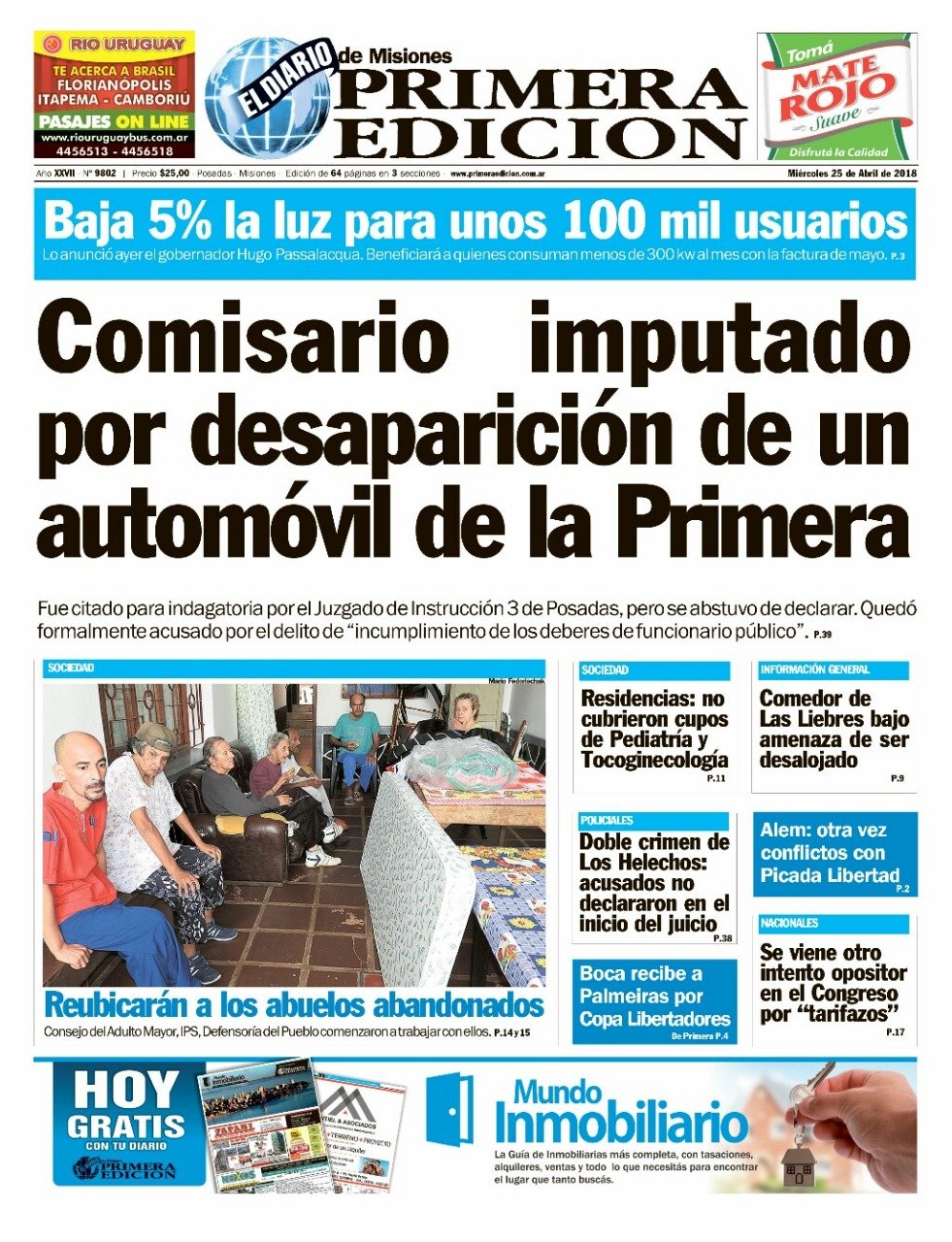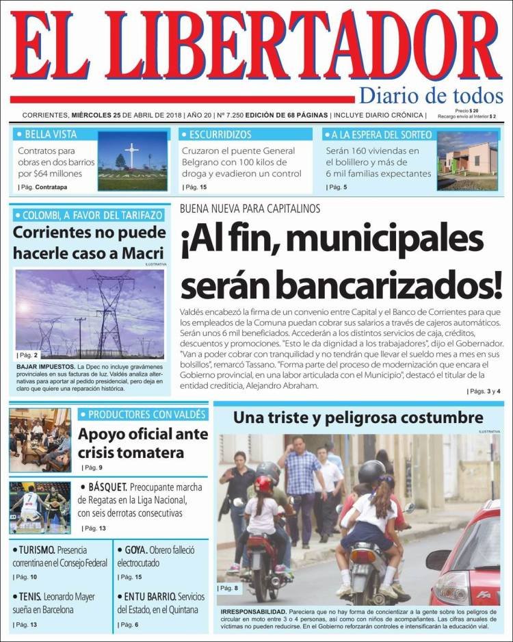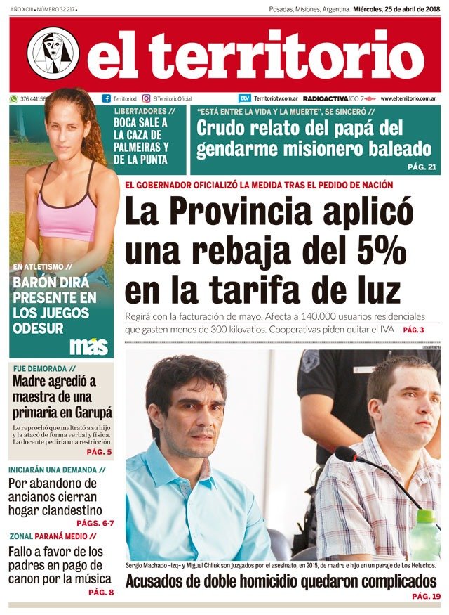 En esta nota podés ver todas las portadas destacadas de los principales periódicos del país. El tema tarifas sigue siendo la noticia tomada por los diarios, ahora con el proyecto de Ley del oficialismo para que las tarifas de los servicios públicos no tengan impuestos y tasas provinciales o municipales. En Misiones el Gobernador anunció una reducción del 5% para los usuarios residenciales.