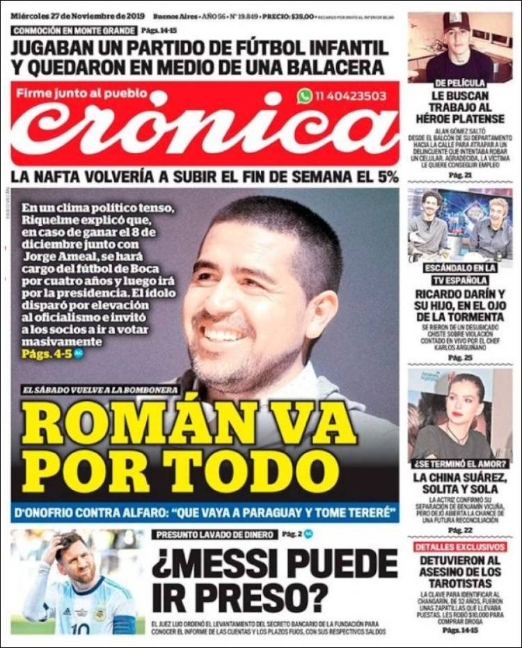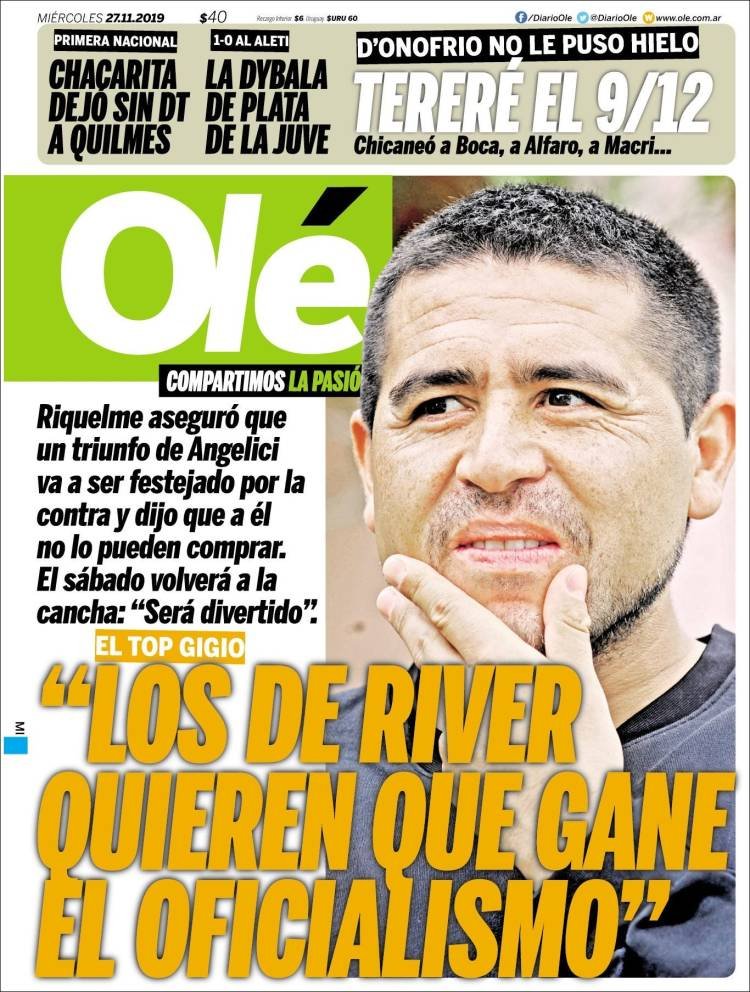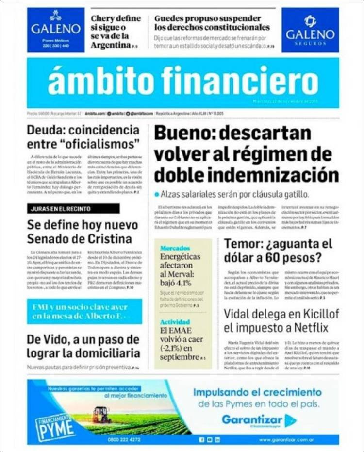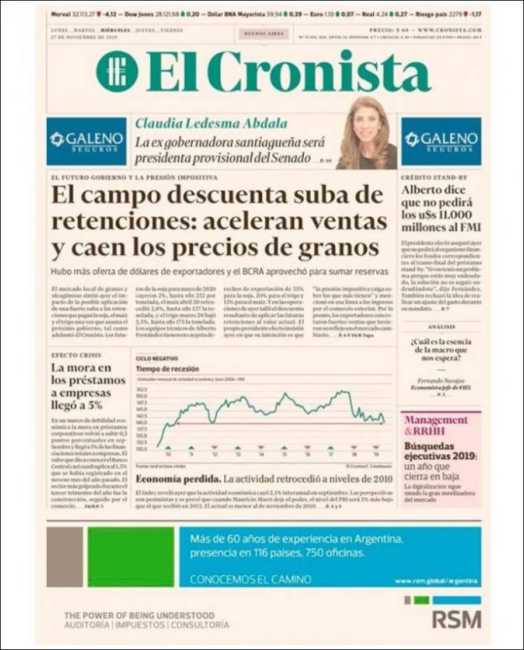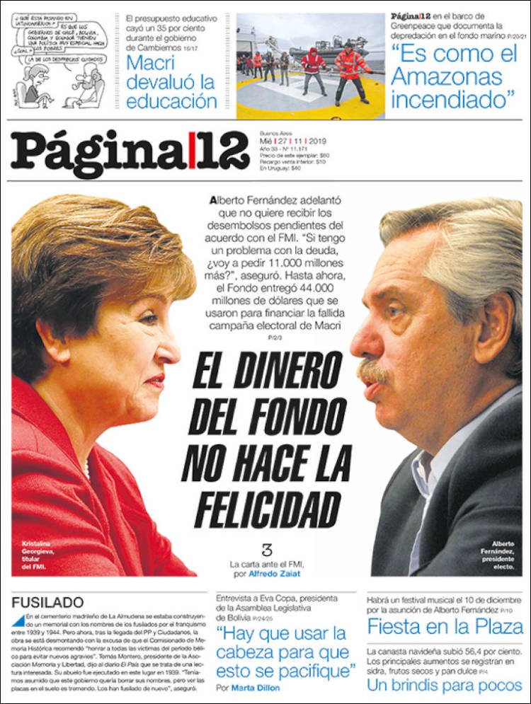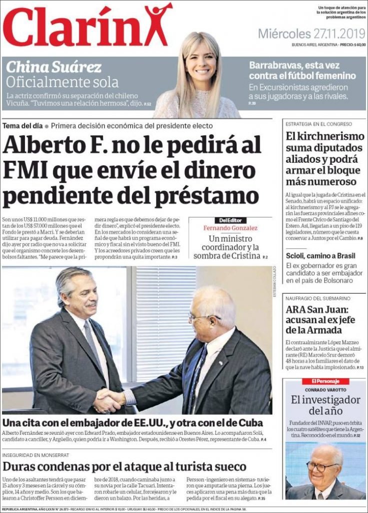 A continuación, repasamos las tapas de los diarios del miércoles 27 de noviembre. El presidente electo, Alberto Fernández, anunció que no le solicitará al FMI el tramo pendiente de u$s11.000 millones.