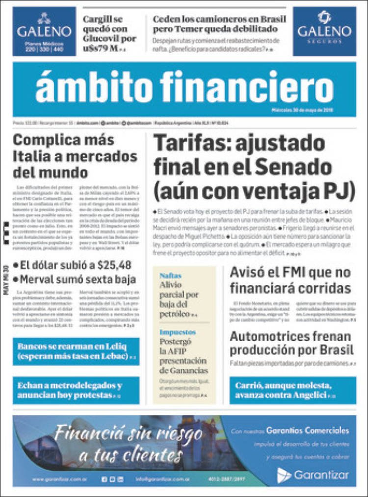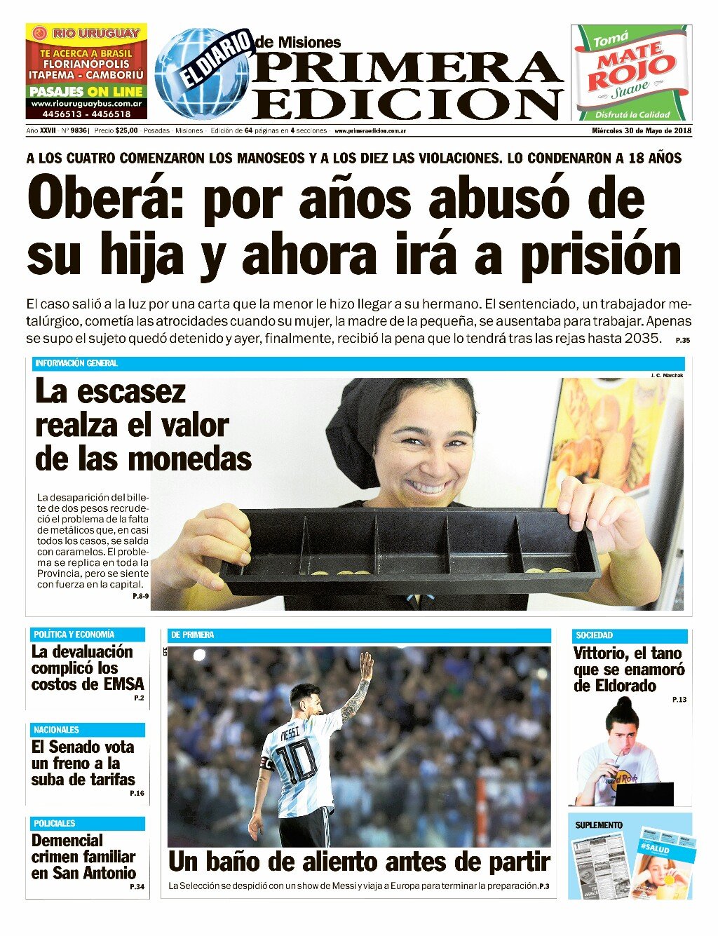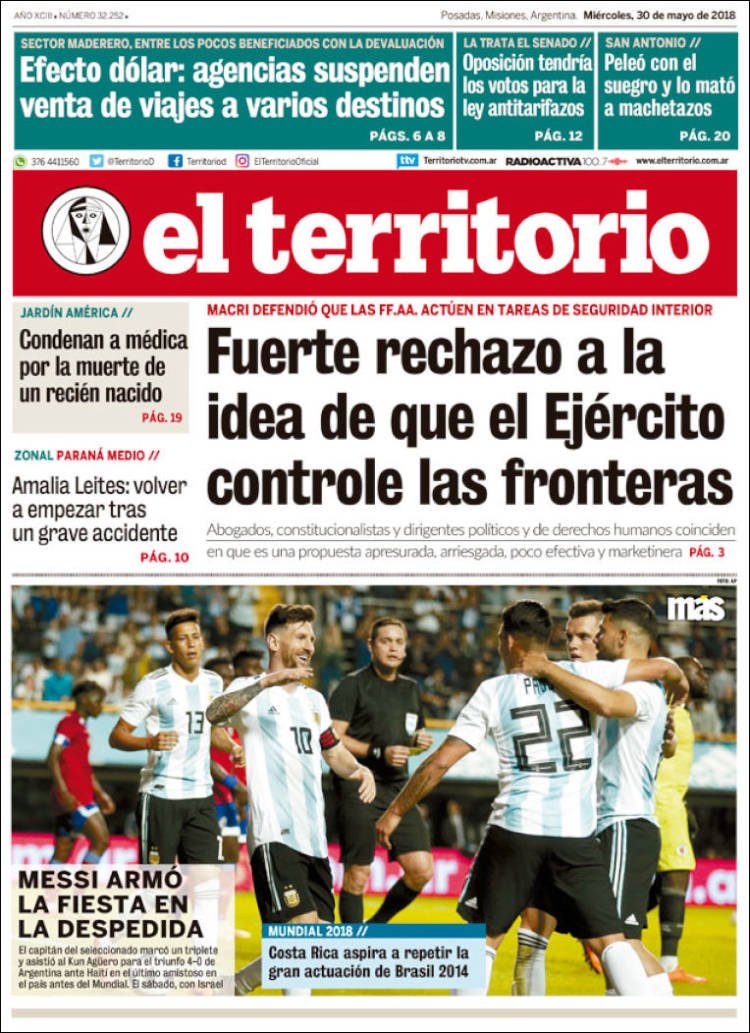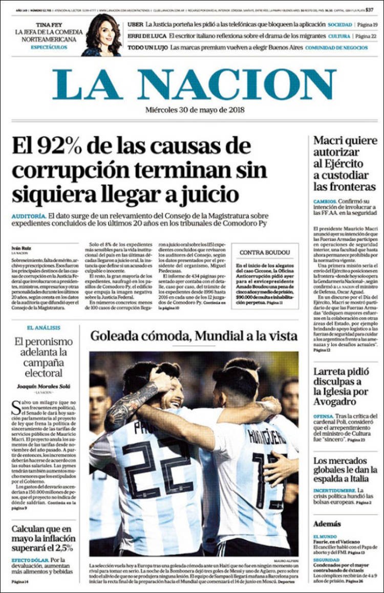 A continuación, repasamos las tapas de los diarios del martes 30 de mayo. La despedida de la Selección Argentina con la goleada a Haití en la cancha de River dominaron las portadas de los diarios. Otro tema dominante es la votación en el Senado por la ley de tarifas, que de aprobarse sería vetada por el presidente Macri.